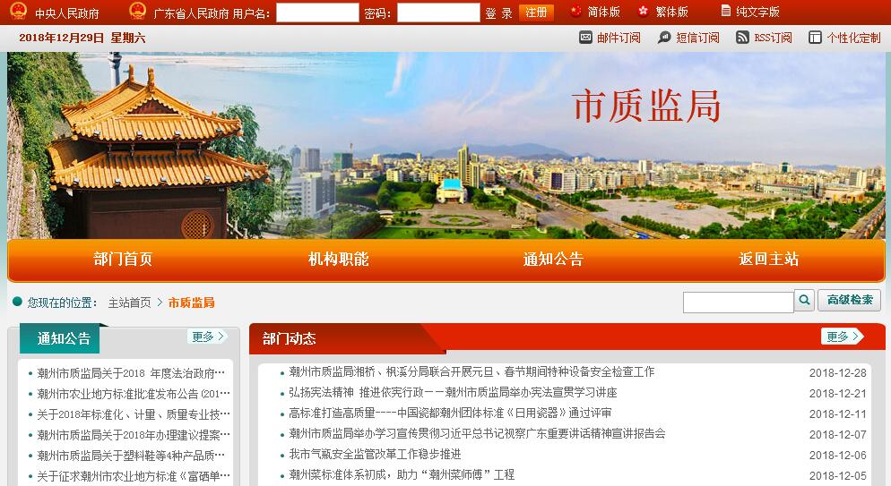 潮州市质量技术监督局主要职责:(一)贯彻落实国家和省、市有关质量技术监督工作的方针政策和法律法规,拟订并组织实施提高全市质量水平的发展战略及有关措施。(二)负责产品质量宏观管理和诚信体系建设工作。组织实 施国家质量发展纲要,推进质量强市和名牌发展战略;完善质量管理体系,营造公平规范的市场秩序,加强事中事后监管,完善标准和质监法制体系。(三)制定现代质量监管体系规划并组织实施。组织质量技术监督科研和技术工作,制订并组织实施质量技术监督科技发展规划。(四)负责监督管理认证工作。按权限依法对产品质量检验 检测机构进行监督管理,依法监管认证机构,依法监督管理体系认证和产品认证工作。(五)负责监督管理标准化工作,推进技术标准战略。推动 地方标准制定工作,监督标准的贯彻执行,推行采用国际标准和 国外先进标准,指导企事业单位的标准化工作,组织实施市组织 机构代码和商品条码工作,监督管理组织机构代码、商品条码和数据识别编码的应用工作。(六)负责统一管理计量工作。组织执行国家计量制度,建设区域最高计量基标准,推行法定计量单位,依法管理计量器具,组织量值传递、溯源和比对工作,推进工业、服务业计量现代化,规范和监督商品量和市场计量行为。(七)负责综合管理特种设备安全监察、监督、风险防范和 伤害监测工作,组织高耗能特种设备节能监管工作,对特种设备进口实施监督检查,依法承担特种设备安全事故调查工作。(八)负责食品相关产品生产加工质量安全监督管理工作。 组织实施监督抽查、风险防范和伤害监测等工作,按规定权限组织调查食品相关产品生产加工涉及的质量安全事故。(九)负责产品质量安全监督工作。组织实施产品质量安全 强制检验、监督抽查、风险防范和伤害监测工作,做好工业产品生产许可证管理,监督管理产品质量安全仲裁检验、鉴定工作。(十)会同有关部门组织实施重大工程设备质量监理制度, 组织重大产品质量事故调查,实施缺陷产品召回制度,监督管理 产品防伪工作;依法查处产品质量违法行为,按分工打击制售假冒伪劣商品违法行为;组织协调开展产品质量安全专项整治和有关专项打假工作,对重大案件进行督查督办。(十一)依法管理和指导全市质量技术监督业务工作。(十二)承办市人民政府和上级质量技术监督机关交办的其他事项。