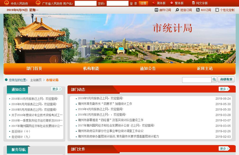 潮州市统计局主要职责:一、贯彻执行国家、省有关统计工作的方针政策和法律法规,拟定和实施统计工作有关规定、规划和统计调查计划;承担组织和协调全市统计工作,确保统计数据真实、准确、及时的责任;监督检查各县(区)、各部门的统计和国民经济核算工作;监督检查统计法律、法规的实施。二、组织实施国民经济核算体系和统计指标体系,执行国家、省统计标准和基本统计报表制度;核算全市及各县区生产总值,监督管理全市各县区国民经济核算工作。三、会同有关部门拟订重大市情市力普查计划、方案,组织实施全市人口、经济、农业等重大市情市力普查,汇总、整理和提供有关市情市力方面的统计数据;组织、协调城市社会经济、农村社会经济和企业等各项调查;汇总、整理全市的基本统计资料;对国民经济、科技进步、社会发展等情况进行统计分析、统计预测和统计监督。四、组织实施农林牧渔业、工业、建筑业、批发和零售业、住宿和餐饮业、房地产业等统计调查,收集、汇总、整理和提供有关调查的统计数据,综合整理和提供地质勘查、旅游、对外经济、交通运输、邮政、教育、卫生、社会保障、公用事业等全市性基本统计数据。五、组织实施能源、投资、科技、人口、劳动力、投入产出、社会发展基本情况等统计调查,收集、汇总、整理和提供有关调查的统计数据。对全市各县区主要耗能行业节能和重点耗能企业能源使用、节约以及资源循环利用状况的统计监测;加强对重点耗能企业节能工作的跟踪、指导和监管;进行相关统计分析;配合节能主管部门开展节能目标考核;依法进行节能调查、统计执法和数据发布。六、对国民经济、社会发展等情况进行统计分析、统计预测和统计监督,向市委、市政府及有关部门提供统计信息和咨询建议。七、依法审批或者备案全市各县区、各部门统计调查项目,指导专业统计基础工作、统计基层业务、统计基础建设,组织建立服务业统计信息共享和发布制度,建立健全统计数据质量审核、监控和评估制度,开展对重要统计数据的审核、监控和评估,依法监督管理全市涉外调查活动。八、指导全市统计专业技术队伍建设,会同有关部门组织管理全市统计专业技术资格考试、职务评聘、从业资格认定工作,会同有关部门监督管理全市县级以上政府统计部门由中央、省级财政提供的统计经费和专项基本建设投资。九、建立健全和管理统计信息自动化系统和统计数据库体系;指导各县区统计数据库和网络的基本标准和运行规则的实施工作,指导全市统计信息化系统建设。十、指导统计基层建设和统计基础工作规范化建设;管理属下事业单位。十一、承办市委、市政府和上级主管部门交办的其他事项。