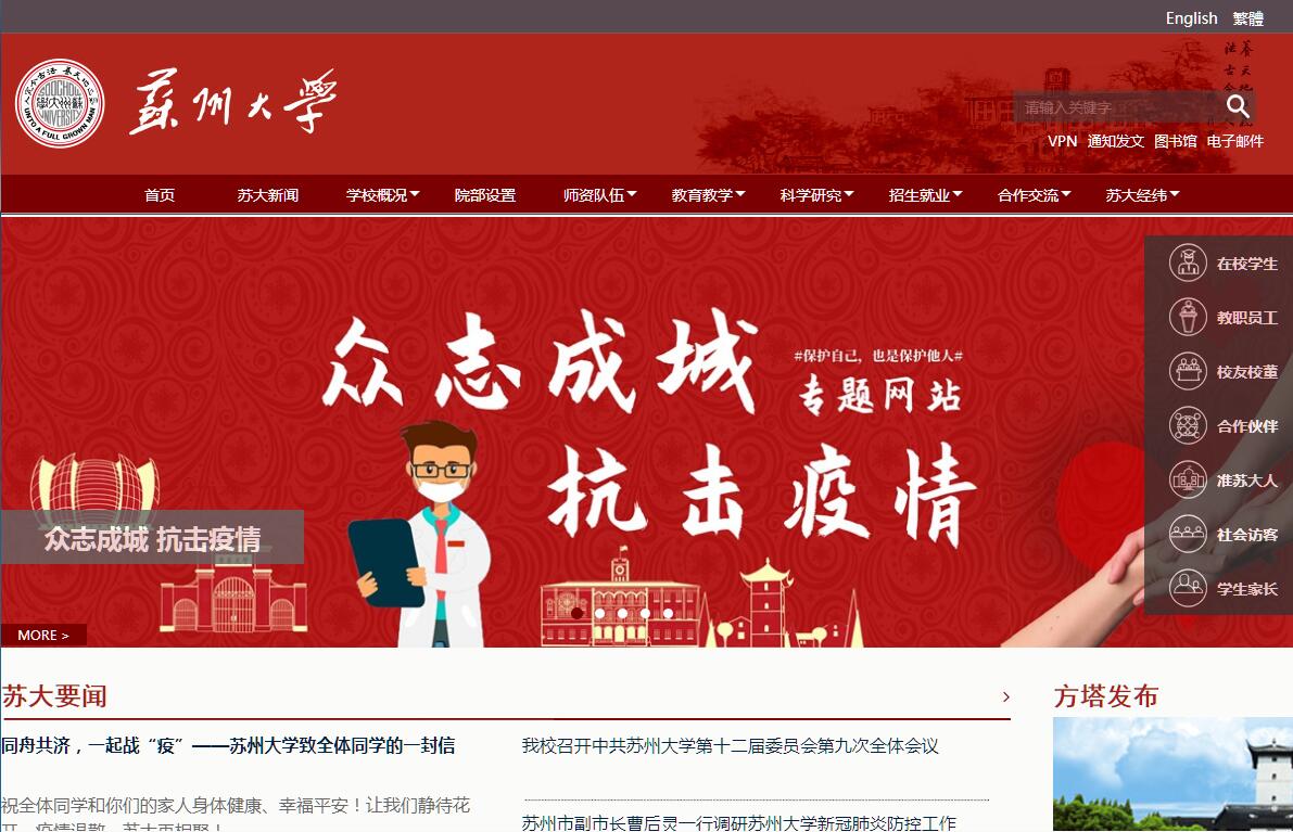 苏州大学坐落于素有“人间天堂”之称的历史文化名城苏州,是国家“211工程”重点建设高校、“2011计划”首批入选高校、“双一流”建设入列高校、国防科技工业局和江苏省人民政府共建高校,是江苏省属重点综合性大学。苏州大学前身是Soochow University(东吴大学,1900年创办),开西式教育之先河,融中西文化之菁华,是中国最早以现代大学学科体系举办的大学。在中国高等教育史上,东吴大学最先开展法学(英美法)专业教育、最早开展研究生教育并授予硕士学位,也是第一家创办学报的大学。1952年中国大陆院系调整,由东吴大学之文理学院、苏南文化教育学院、江南大学之数理系合并组建苏南师范学院,同年更名为江苏师范学院。1982年,学校更复名苏州大学(Soochow University)。其后,苏州蚕桑专科学校(1995年)、苏州丝绸工学院(1997年)和苏州医学院(2000年)等相继并入苏州大学。从民国时期的群星璀璨,到共和国时代的开拓创新;从师范教育的文脉坚守,到综合性大学的战略转型与回归;从多校并入的跨越发展,到争创一流的重塑辉煌,苏州大学在中国高等教育史上留下了浓墨重彩的一笔。 一个多世纪以来,一代代苏大人始终秉承“养天地正气,法古今完人”之校训,坚守学术至上、学以致用,倡导自由开放、包容并蓄、追求卓越,坚持博学笃行、止于至善,致力于培育兼具“自由之精神、卓越之能力、独立之人格、社会之责任”的模范公民,在长期的办学过程中为社会输送了50多万名各类专业人才,包括许德珩、周谷城、费孝通、雷洁琼、孙起孟、赵朴初、钱伟长、董寅初、李政道、倪征日奥(yù)、郑辟疆、杨铁樑、查良镛(金庸)等一大批精英栋梁和社会名流;谈家桢、陈子元、郁铭芳、宋大祥、詹启敏等30多位两院院士,为国家建设与社会发展作出了重要贡献。苏州大学现有哲学、经济学、法学、教育学、文学、历史学、理学、工学、农学、医学、管理学、艺术学等十二大学科门类。学校设有26个学院(部),拥有全日制本科生26873人,全日制硕士生9599人,在职专业学位硕士1844人,全日制博士生1567人,临床博士1766人,各类留学生2598人。学校现设131个本科专业;51个一级学科硕士学位授权点,24个专业学位硕士点;28个一级学科博士学位授权点,1个专业学位博士点,29个博士后流动站;学校现有4个国家重点学科,8个江苏高校优势学科,5个江苏省重点序列学科,15个“十三五”江苏省一级学科重点学科。截止目前,学校化学、物理学、材料科学、临床医学、工程学、药学与毒理学、生物与生物化学、神经科学与行为科学、分子生物与遗传学共9个学科进入全球基本科学指标(ESI)前1%,化学、材料科学2个学科进入全球基本科学指标(ESI)前1‰。学校现有2个国家级人才培养基地,3个国家级实验教学示范中心,1个国家级虚拟仿真实验教学示范中心,2个国家级人才培养模式创新实验区,1个国家级大学生校外实践教学基地;1个国家2011协同创新中心(牵头单位);1个教育部人文社科重点研究基地,1个国家工程实验室,2个国家地方联合工程实验室,2个国家级国际合作联合研究中心,1个国家创新人才培养示范基地,3个国家级公共服务平台,1个国家大学科技园,1个国家重点实验室培育基地,1个江苏省高校国家重点实验室培育建设点,4个江苏高校协同创新中心18个省部级哲社重点研究基地,30个省部级重点实验室,11个省部级公共服务平台,4个省部级工程中心。目前,全校教职工5182人,具有副高职称及以上人员2487人,其中诺贝尔奖获得者1人,中国科学院及工程院院士7人,发达国家院士4人;“千人计划”入选者18人、“青年千人计划”入选者47人,“长江学者”特聘教授10人、“长江学者”青年学者6人,国家杰出青年基金获得者25人、国家优秀青年基金获得者32人,“万人计划”杰出人才1人、“万人计划”科技创新领军人才8人、“万人计划”青年拔尖人才3人,国务院学位评定委员会学科评议组成员6人,一支力量比较雄厚、结构比较合理的师资队伍已初步形成。苏州大学将人才培养作为学校的中心工作,以立德树人为根本,以培养具备责任感、创新性、应用性和国际性的卓越型人才为定位,以通识教育与专业教育相融合为指导,以提升学生综合素质、夯实专业基础、培养创新创业能力为重点,积极深化人才培养系统化改革,不断提升人才培养质量。学校纳米科学技术学院被列为全国首批17所国家试点学院之一,成为高等教育体制机制改革特区;学校设立了2个书院,积极探索人才培养新模式,其中敬文书院定位于专业教育之外的“第二课堂”,唐文治书院在“第一课堂”开展博雅教育。近年来,学校学生每年获得国家级奖项200余人次。2013年我校成功举办第十三届“挑战杯”全国大学生系列科技学术竞赛,并以团体总分全国第二的成绩再捧优胜杯;在2015年第十四届“挑战杯”中,1个项目获一等奖、2个项目获二等奖,再次蝉联优胜杯。在近四届奥运会上,陈艳青、吴静钰、孙杨和周春秀四位同学共获得了“五金一银一铜”的佳绩,国际奥委会主席罗格先生特别致信表示感谢。学校实施“顶天立地”科技创新战略,科研创新工作取得累累硕果。2017年,人文社科领域获得国家级项目29项,其中重大项目2项,重点项目2项;自然科学领域获国家自然科学基金360项,立项数位列全国高校第16位,蝉联地方高校第1位,连续六年稳居全国高校20