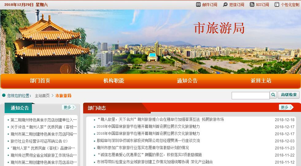 潮州市旅游局主要职责:(一)贯彻执行国家、省有关旅游工作的法律法规和方针政策,协调全市旅游业改革与发展工作;起草有关规范性文件,制订全市旅游发展战略、规划、政策,经批准后组织实施;指导各区县旅游工作。(二)研究和推进旅游综合改革;协调旅游安全、旅游应急救援、节假日旅游、红色旅游、旅游扶贫等工作,引导休闲度假,协调和推动国民旅游休闲计划实施;监测旅游经济运行,负责全市旅游统计工作及行业信息发布。(三)会同有关部门编制发展旅游产业的中、长期规划和年度计划;组织对全市旅游资源的普查、保护、开发与利用工作;引导旅游业社会投资,引导旅游产品发开和旅游制造业发展;指导重点旅游区域、景区景点和旅游产品的规划与建设,指导旅游景区开展质量等级评定工作。(四)制订和组织实施开拓国内、国际旅游客源市场的规划、计划;组织协调潮州旅游整体形象的对外宣传和促销推广活动;开发推广旅游市场和旅游线路;负责国内、国际旅游交流与合作事务。(五)负责旅游行业管理工作,依法负责有关旅游业务的审核、审批工作和出入境旅游管理工作;牵头开展旅游综合执法工作,负责监督管理旅游市场秩序和服务质量;组织实施旅游区、旅游设施、旅游服务、旅游产品等行业标准工作,指导旅游饭店评定星级工作;指导旅游行业精神文明建设和诚信体系建设;指导行业组织的业务工作。(六)组织制订和实施旅游信息化建设发展规划,推动旅游与信息化融合发展;会同有关部门推进旅游公共服务体系规划、建设和管理工作,推进旅游产业与各个产业的融合发展,组织指导和促进旅游产品(商品)的开发。(七)制订并组织实施旅游人才规划,组织指导旅游教育培训工作;会同有关部门指导实施旅游从业人员职业资格标准和等级标准工作;负责全市导游人员的管理工作。(八)承担市旅游产业发展协调领导小组的日常工作。(九)管理属下事业单位。(十)承办市委、市政府和上级有关部门交办的其他事项。