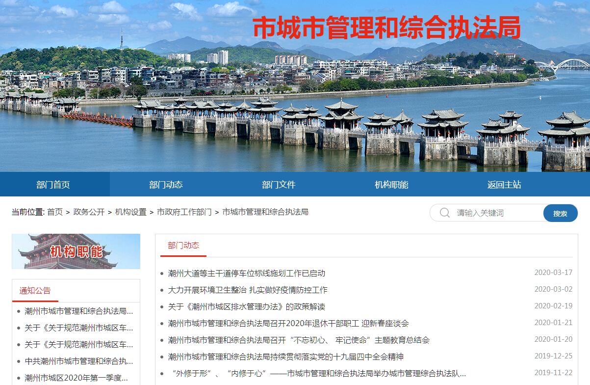 潮州市城市管理和综合执法局主要职责:(一)贯彻执行国家和省有关城市市政、园林绿化、市容环境卫生、风景名胜区等城市管理的方针政策和法律法规,起草相关的规范性文件,拟订城市市政建设、园林绿化、市容环境卫生等方面的专项规划、中长期发展规划和年度计划,经批准后组织实施。(二)牵头组织开展城市管理的综合整治和专项整治工作;负责指导、检查、监督市辖区的城市综合管理工作。(三)负责市城区城市管理(不含城市建设、城市规划管理)的行政执法工作,对违反有关城市管理(不含城市建设、城市规划管理)规定的行为实施行政处罚,按授权调动市各城管职能部门的执法队伍。(四)负责组织城市管理责任单位对城市管理工作的检查、评议、考核、总结、奖惩;负责市与区之间、部门之间在城市管理工作中需要协调的事宜。(五)办理由政府投资的各项市政建设项目的有关事项。(六)负责组织市政公用设施的管理和维护;审核本级权限涉及的市政公用设施的建设项目,并指导、监督实施;负责组织市城区户外市政排水管网的规划、建设、管理和维护工作。(七)负责市区并指导全市供水的规划以及供水行业的建设和管理工作,负责污水处理厂的建设管理工作。(八)负责对市政建设、城市绿化、市容环境卫生等有关事项的审核、审批、报批和监督管理工作;按授权负责市城市规划区范围内户外广告资源使用权的拍卖工作。(九)负责市城区城市绿化的管理工作。(十)负责西湖风景名胜区的规划审查、报批、建设、管理、利用、保护等工作。(十一)组织城市绿化、市政园林的科研活动,推广应用相关的科技成果。(十二)协调和监督检查城市综合管理执法工作,组织业务培训和业务考核。(十三)负责城市综合管理有关法律、法规知识的宣传普及,提高公民的城市综合管理意识。(十四)管理属下单位。(十五)承办市委、市政府和上级主管部门交办的其他事项。