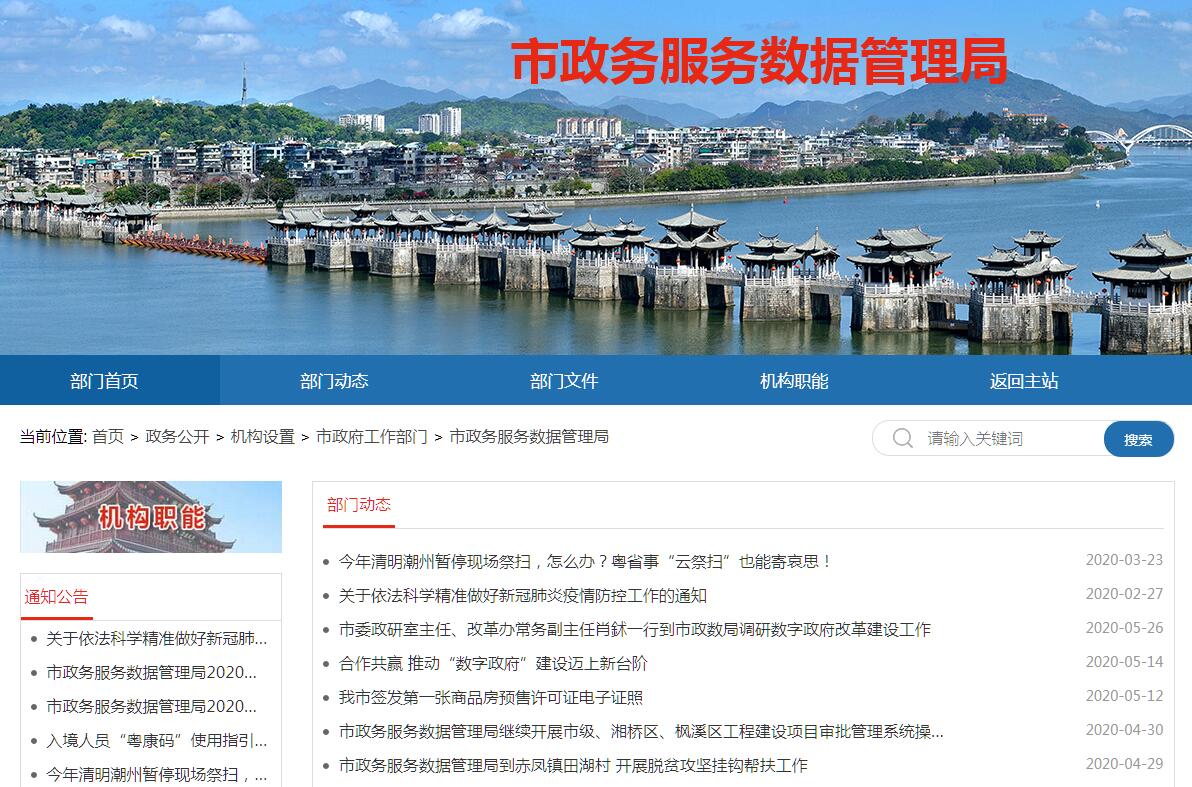 潮州市政务服务数据管理局主要职责:(一)组织起草全市政务服务和政务信息化相关规范性文件并组织实施。(二)负责全市行政审批制度改革、审批服务便民化相关工作,负责全市政务服务事项目录管理和标准化建设。(三)负责市级政务服务大厅的日常管理,协调进驻大厅各部门、综合窗口与进驻部门之间的工作;负责进驻大厅工作人员的管理和考核工作;负责召集有关职能部门和单位,召开联审会议或联合进行实地勘查。(四)统筹推进“数字政府”改革建设,拟订建设规划和年度建设计划并组织实施。负责“数字政府”平台建设运维资金管理工作。(五)负责对市级政务信息化项目建设实施集约化管理,负责市财政资金建设的政务信息系统项目立项审批,加强宏观管理和统筹协调。(六)统筹协调市级部门业务应用系统建设,统筹管理政务云平台和电子政务外网,指导全市各级各部门网上政务应用和建设。(七)负责政务服务、电子政务标准体系建设和相关标准规范的制定,推进全市政务服务和电子政务标准化工作。(八)组织协调推进政务数据资源共享和开放,统筹政务数据资源的采集、分类、管理、分析和应用工作。(九)统筹全市电子政务基础设施、信息系统、数据资源等安全保障工作,负责“数字政府”平台安全技术和运营体系建设,监督管理市级信息系统和数据库安全。(十)负责市12345投诉举报平台的规划建设和运作管理;负责对市直各部门和事业单位的机关效能监督投诉。(十一)统筹推进全市政务服务体系建设,指导全市各级政务服务机构及其管理机构开展工作。(十二)贯彻执行国家和省有关公共资源交易的法律、法规、规章和政策;负责公共资源交易平台指导、管理和监督相关工作。(十三)管理市公共资源交易中心。(十四)完成市委、市政府和省政务服务数据管理局交办的其他任务。