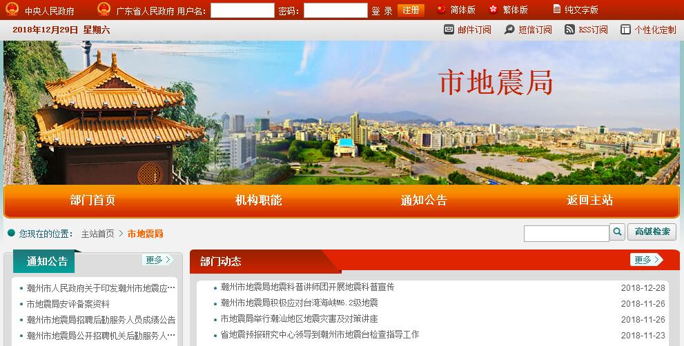 潮州市地震局为市人民政府直属的正处级事业单位,赋予防震减灾工作的行政管理职能。其主要职责:(一)贯彻落实国家和省防震减灾工作的方针、政策、法规,组织起草有关地方规范性文件,并监督检查其执行情况。(二)制订防震减灾事业中长期发展规划,编制防震减灾工作年度计划,并组织实施;管理监督防震减灾事业费和专项资金的使用。(三)管理地震监测工作,组织和管理群众测报工作,负责提出地震趋势意见;保护地震监测设施和地震观测环境。(四)承担在破坏性地震发生后市政府抗震救灾指挥机关办事机构的职责。参与城市总体规划中城市抗震防灾规划的审查,会同有关部门和协助政府拟定破坏性地震应急预案,综合防御措施,检查监督其落实。负责震情速报和地震灾情速报;负责地震灾害损失评估;参与制定地震灾区重建规划。(五)管理地震烈度区划和震害预测工作;参与城市总体规划中“城市抗震防灾规划”的审查;管理城镇、经济开发区以及重大工程建设场地的地震安全性评价工作;负责地震安全性评价工作资格审查、认证和任务登记。会同有关部门管理海洋地震及地震次生灾害的防灾工作。(六)管理以地震动参数和烈度表述的抗震设防技术参数,负责工程抗震设防设计规范技术标准的审定和修定,参加重点建设工程抗震设计的会审,指导和监督重大工程以及重要设施的抗震设防工作。(七)推进地震科技现代化;组织管理地震科学技术研究,科技成果的推广应用;组织开展地震科技工作与交流。(八)会同有关部门开展防震减灾宣传教育工作,普及防震减灾知识,提高全社会的减灾意识。(九)管理所属事业单位及地方地震台站,负责市防震抗震领导小组办公室的日常工作。指导县区防震减灾工作。(十)承办市委、市人民政府和上级地震局交办的其他事项。