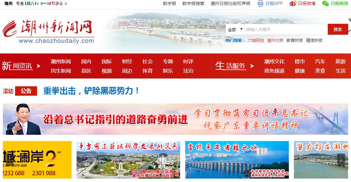 | 网站简介: 潮州新闻网-潮州第一门户网站-潮州日报官方网站。潮州新闻网是潮州发布新闻量最大、最具权威性的新闻门户网站,是外界了解潮州、获取潮州本地新闻及信息的最佳桥梁和窗口。 |