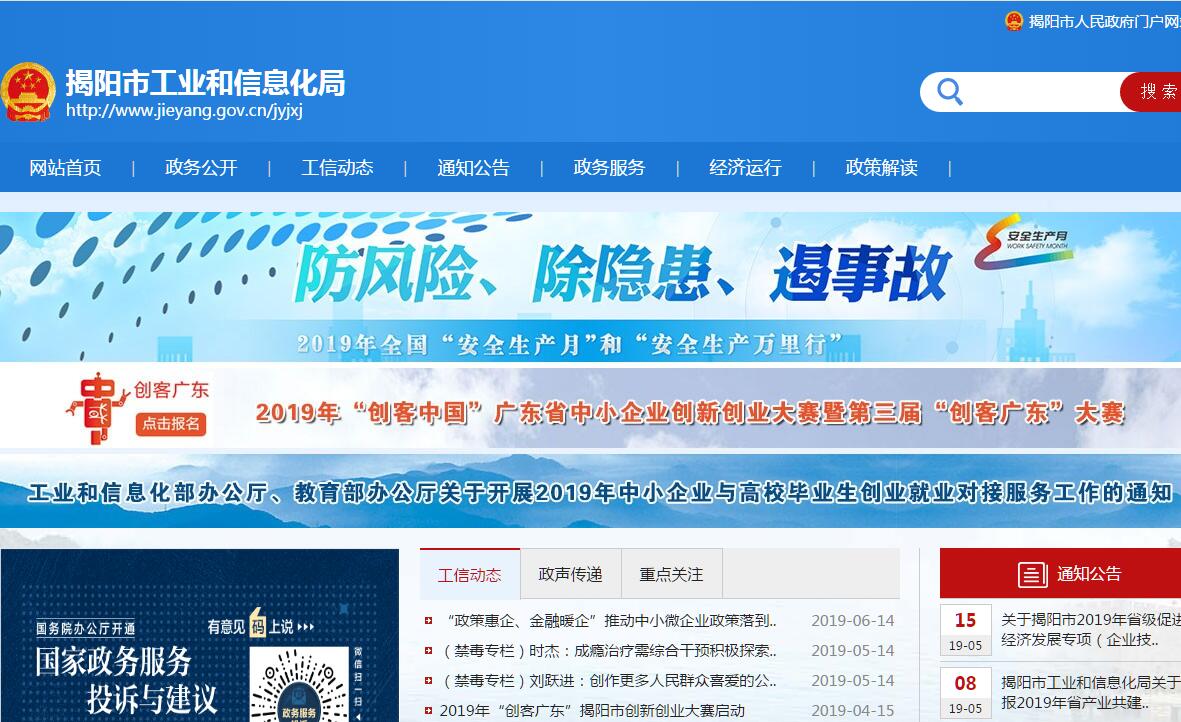 揭阳市经济和信息化局主要职责:(一)贯彻执行国家和省有关经济和信息化的方针政策和法律法规,起草工业、信息化的地方规范性文件草案;研究提出全市新型工业化发展战略,推进信息化和工业化融合。(二)拟订并组织实施工业、信息化领域发展规划、计划,组织实施工业、软件业和信息服务业的产业政策,提出优化产业布局、结构的政策建议,制定并组织实施产业结构调整实施方案;指导工业企业加强质量管理,牵头实施名牌带动战略;指导工业、相关生产服务业、软件和信息服务业领域加强安全生产工作。(三)监测分析工业、信息化领域运行态势并做好相关信息发布,进行预测预警和信息引导,组织实施近期经济运行调控措施,统筹协调经济运行和信息化建设中的重大问题并提出政策建议;组织协调全市煤炭、电力、油品和重点物资运输能力等供应,负责工业、信息化领域的应急物资管理和运输有关工作。(四)执行有关固定资产投资政策,编制工业、信息化领域企业技术改造、技术创新等专项资金年度投资计划并组织实施,审核、上报和办理需经国家、省和市审批、核准、备案的企业技术改造、技术创新投资项目,提出促进工业、信息化领域企业技术改造、技术创新投资的措施和意见。(五)指导工业、信息化领域的技术进步、技术创新、技术引进、消化吸收和再创新、重大技术装备国产化、重大技术装备研制和设备招标工作,推进相关科研成果产业化。(六)负责全社会节能工作,拟订并组织实施能源节约、循环经济、资源综合利用和促进清洁生产的规划及政策措施;牵头协调以节能降耗为主要内容的新产品、新技术、新设备、新材料的推广应用工作;推动循环经济系统工程建设;组织协调节能环保产业发展。(七)拟订并组织实施全市承接产业转移总体规划和政策措施、产业转移工业园区中长期发展规划和政策措施;承担产业转移工业园区的综合协调和提质发展、扩能增效工作,研究协调产业转移工业园区发展中的重大问题,提出政策建议。(八)牵头负责企业数据信息采集、统计、分析、报告等企业情况综合工作;牵头做好培育大型骨干企业工作;负责中小微企业和民营经济发展的宏观指导和服务,综合协调有关部门拟订促进中小微企业和民营经济发展的政策措施;协调解决中小微企业和民营经济发展中的有关重大问题。(九)统筹推进全市经济和社会信息化工作,协调指导经济社会领域的信息化应用;推进信息技术和互联网的普及应用,推进信息化和工业化融合;统筹推进电子政务;协调推进信息化基础设施建设。(十)研究拟订并组织实施大数据战略、规划和政策措施;研究制定大数据收集、管理和开发应用的标准规范;协调、组织实施国家和地方数据技术标准;协调经济社会数据资源的组织管理;指导推进社会经济各领域大数据开发应用,协调解决有关重大问题。(十一)负责信息网络基础设施建设的规划、协调和管理,协调通信管线、站点、公共通信网规划,推进面向社会服务信息网络的资源共享和互联互通。(十二)协助推进市的重点信息化工程,负责信息安全的统筹规划、组织推动和协调管理,协调信息安全保障体系建设。(十三)配置和管理无线电频谱资源,依法监督管理无线电台(站);负责无线电监测、检测、干扰查处工作,协调处理电磁干扰事宜,维护空中电波秩序,依法组织实施无线电管制。(十四)组织指导民用部门军品配套工作,负责民用爆炸物品的行业管理及其流通安全的监督管理。(十五)指导协调工业、信息化领域的对外交流与合作,协调烟草工业生产和专营管理。(十六)承办市人民政府、省经济和信息化委员会交办的其他事项。
