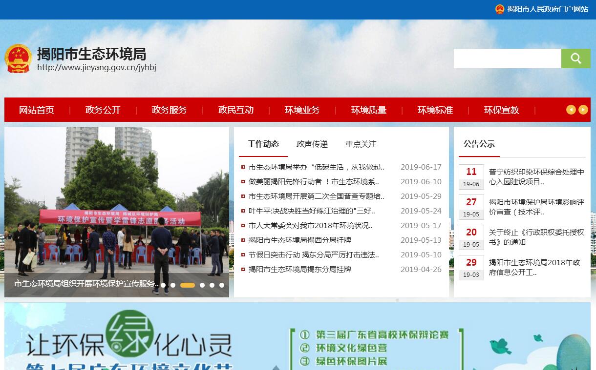 揭阳市生态环境局主要职责:(一)贯彻执行国家和省有关环境保护的方针政策和法律法规,拟订并监督实施本市环境保护规章和标准,组织编制环境功能区划,拟订全市环境保护规划,组织拟订并监督实施重点区域、流域污染防治规划和饮用水水源地环境保护规划,会同有关部门拟订重点海域污染防治规划,参与拟订市主体功能区划。(二)负责重大环境问题的统筹协调和监督管理。牵头协调重大环境污染事故、生态破坏事件的调查处理和重点区域、流域、海域环境污染防治工作,指导协调全市重大突发环境事件的应急、预警工作,协调解决跨区域环境污染纠纷,指导、协调和监督海洋环境保护工作。(三)承担落实全市污染减排目标的责任。组织制定主要污染物排放总量控制制度并监督实施,提出实施总量控制的指标,督查、督办、核查各地污染物减排任务的完成情况,牵头实施环境保护目标责任制、总量减排考核并公布考核结果。(四)指导并监督管理排污费得征收和使用,会同有关部门管理市级环境保护资金。(五)承担从源头上预防、控制环境污染和环境破坏的责任。受市人民政府委托对重大经济和技术政策、发展规划以及重大经济开发计划进行环境影响评价,对涉及环境保护的法规草案提出有关环境影响方面的建议,按管理权限审批开发建设区域、项目环境影响评价文件,负责建设项目竣工环境保护验收。(六)负责环境污染防治的监督管理。制定水体、大气、土壤、噪声、光、恶臭、固体废物、化学品、机动车等的污染防治管理制度并组织实施,会同有关部门监督管理饮用水水源地环境保护工作,组织指导城镇和农村的环境综合整治工作,牵头组织强制性清洁生产审核工作,负责环境监察和环境保护行政稽查,组织实施排污申报登记、排污许可证、重点污染源环境保护信用管理等各项环境管理制度。(七)指导、协调、监督生态保护工作。拟订生态保护规划,组织评估生态环境质量状况,监督对生态环境有影响的自然资源开发利用活动、重要生态环境建设和生态破坏恢复工作,指导、协调、监督各种类型的自然保护区、风景名胜区、森林公园的环境保护工作,协调和监督野生动植物保护、湿地环境保护工作,负责全市自然保护区的综合管理,指导、协调全市农村生态环境保护和生态示范区建设,监督生物技术环境安全,牵头组织生物物种(含遗传资源)资源保护工作,组织协调生物多样性保护。(八)负责民用核与辐射环境安全的监督管理。协助监督管理核设施安全,负责辐射环境、放射性废物管理工作;负责核事故、辐射环境事故和应急的有关工作;监督管理发射源、电磁辐射、伴有放射性矿产资源开发利用中的污染防治工作。(九)负责环境监测和发布环境状况公报、重大环境信息。组织对全市环境质量监测和污染源监督性监测,组织对环境质量状况进行调查评估、预测预警,组织建设和管理本市环境监测网和环境信息网。(十)开展环境保护科技工作。组织环境保护重大科学研究和技术工程示范,参与指导和推动环境保护产业发展。(十一)组织、指导和协调环境保护宣传教育工作。制定并组织实施环境保护宣传教育纲要,开展生态文件建设和环境友好型社会建设的有关宣传教育工作,推动社会公众和社会组织参与环境保护。(十二)承办市人民政府和省环境保护厅交办的其他事项。