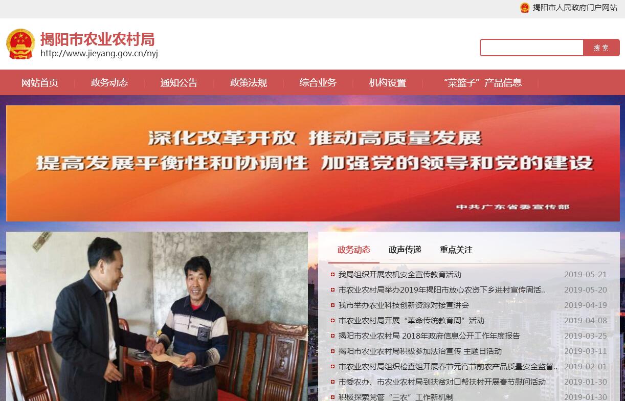 揭阳市农业农村局主要职责:(一)贯彻执行国家和省有关农业农村工作的方针政策和法律法规,组织起草农业和农村经济的规范性文件、参与农业和农村经济社会改革与发展重大问题的调查研究并提出政策建议。(二)拟订种植业、畜牧业、农业机械化等农业有关产业(以下简称农业)和农村经济发展、发展战略、中长期发展规划并指导实施,参与涉农政策制定,负责组织全市畜禽屠宰行业管理工作,组织、指导、监督全市农业行政执法工作。(三)承担完善农村经营管理体制的工作。提出深化农村经济体制改革和稳定完善农村基本经营制度的政策建议,指导农村土地承包、土地承包经营权流转、承包纠纷仲裁,指导、监督减轻农民负担和村民筹资筹劳工作。拟订农业产业化经营的发展规划并组织实施,推动农业社会化服务体系、农村合作经济组织、新型农业经营主体的建设与发展。组织实施政策性农业保险工作。(四)组织落实促进粮食、畜禽产品等主要农产品生产发展的相关政策措施,引导农业产业结构调整和产品品质的改善。组织实施农业标准化、规模化生产。提出农业固定资产投资规模和方向、国家和省财政性资金安排的意见,提出扶持农业农村发展的财政措施和项目建议。(五)拟订农产品加工业发展规划并组织实施,促进农业产前、产中、产后一体化发展。提出农业产业保护、促进大宗农产品流通和农产品进出口的政策建议。参与制订农产品专业批发市场体系建设与发展规划。培育、保护和发展农产品品牌,指导休闲农业发展。(六)负责农产品质量安全监督管理。负责农产品质量安全监测,指导农业检验检测体系建设,完善农产品质量管理体系,负责食用农产品(水产品除外)从种植养殖环节到进入批发、零售市场或生产加工企业前的质量安全监督管理,负责奶畜饲养以及生鲜乳生产环节、收购环节的监督管理,依法开展农产品质量安全风险评估,发布有关农产品质量安全状况信息,依法管理农业标准化工作,组织实施符合安全标准的农产品认证。(七)组织、协调农业生产资料市场体系建设.依法开展农作物种子(种苗)、草种、种畜禽、肥料、农药、兽药、饲料、饲料添加剂、农业转基因生物生产加工、动物防疫条件的监督管理。会同有关部门监督实施农业生产资料国家标准。负责农业机械的安全监理和产品质量监督管理工作。(八)负责动物重大疫病和农作物重大病虫害监测预警与防控。起草动植物防疫和检疫的地方性文件。会同有关部门制定动植物防疫检疫方案,指导动植物防疫和检疫体系建设。组织监督动植物的防疫检疫工作,组织重大植物检疫性有害生物监测、普查。组织兽医医政、兽药药政药检工作,负责执业兽医的管理。(九)承担农业救灾复产工作。监测农业灾情,组织种子、化肥、农药、农机设备、防疫物资等救灾物资储备和调拨,提出生产救灾资金安排建议,指导农业救灾和灾后恢复生产。承担农业重大突发事件应急管理。(十)制定农业科技、农技推广的规划和有关文件,指导现代农业产业技术体系和技术推广体系建设,组织实施农业科研、成果转化、科技示范和技术推广,组织引进国外农业优良品种与先进技术。负责农业科技成果管理、农业植物新品种保护和农业转基因生物安全监督管理。(十一)会同有关部门拟订农业农村人才队伍建设规划并组织实施,指导农业教育和农业职业技能开发工作,参与组织实施农村实用人才培训和新型职业农民培训工作,会同有关部门依法实施农业农村人才专业技术资格和从业资格管理。(十二)组织农业资源区划工作,指导农用地、宜农滩涂、宜农湿地、牧草地和农业生物物种资源的保护和管理,负责野生植物保护工作。拟订耕地及基本农田质量保护与改良方案并指导实施,依法管理耕地质量。牵头拟订农田基本建设规划,运用工程设施、农艺、农机、生物等措施发展节水农业。(十三)制定并实施农业生态建设规划,指导农村可再生能源综合开发与利用,指导农业生物质产业发展和农业农村节能减排,指导农业面源污染治理工作。指导、协调划定农产品禁止生产区域工作,指导生态农业、循环农业的发展。(十四)负责农业信息体系建设,会同有关部门监测分析农业和农村经济运行情况,开展相关农业统计工作。发布农业和农村经济信息。指导农业信息服务。(十五)组织开展国内外农业经济、技术交流与合作。(十六)承办市委、市人民政府和省农业厅交办的其他事项。
