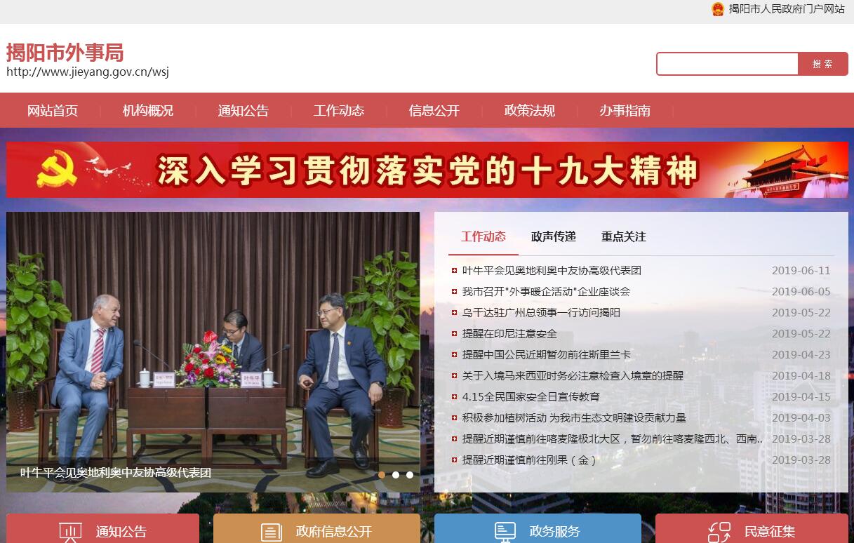 揭阳市外事局是主管外事侨务港澳工作的市人民政府组成部门。其主要职责:(一)贯彻执行中央、省的外事侨务及港澳工作方针政策和法律法规,调查研究国内外侨情和侨务工作情况,制订外事侨务港澳工作发展规划及规章制度,并组织实施。(二)开展对华侨、华人、港澳同胞及社团的团结友好工作;组织接待外国访揭的党宾、国宾、友好人士以及重要来宾;接待和管理来揭从事公务活动的各国外交人员和外国记者;承办市领导的对外交往工作。(三)负责因公临时出访管理工作,承办审批、审核市政府授权范围内单位派遣团(组)出国、赴港澳地区和邀请外国人来揭访问的有关事项;承办市级领导出访报批工作;办理因公出国、赴港澳人员的护照(通行证)颁发、签证(签注)工作。(四)配(六)负责华侨、港澳同胞捐赠款物的审核及监督管理工作;参与华侨、外籍华人、港澳同胞的资金、人才、技术引进工作,并对已引进重点侨资项目进行跟踪服务。(七)负责对外民间交流和友好城市工作,指导市人民对外友好协会工作;负责办理和指导、协调揭港澳官方、半官方、重要民间往来事宜。(八)执行党和国家的对外宣传方针和政策,联系华侨华人传播媒体、文化社团及海外华文学校、开展对外宣传、文化交流及华文教育工作。(九)统筹提出外事、侨务活动安排意见。(十)协调指导各县(市、区)、市直各部门的重要外事活动,指导外事业务、监督执行外事纪律。(十一)在中央、省委、市委对台工作方针指导下,通过侨务渠道开展海外对台工作。(十二)指导县(市、区)外事侨务工作。(十三)承办市人民政府和省人民政府外事办公室、侨务办公室、港澳事务办公室交办的其他事项。