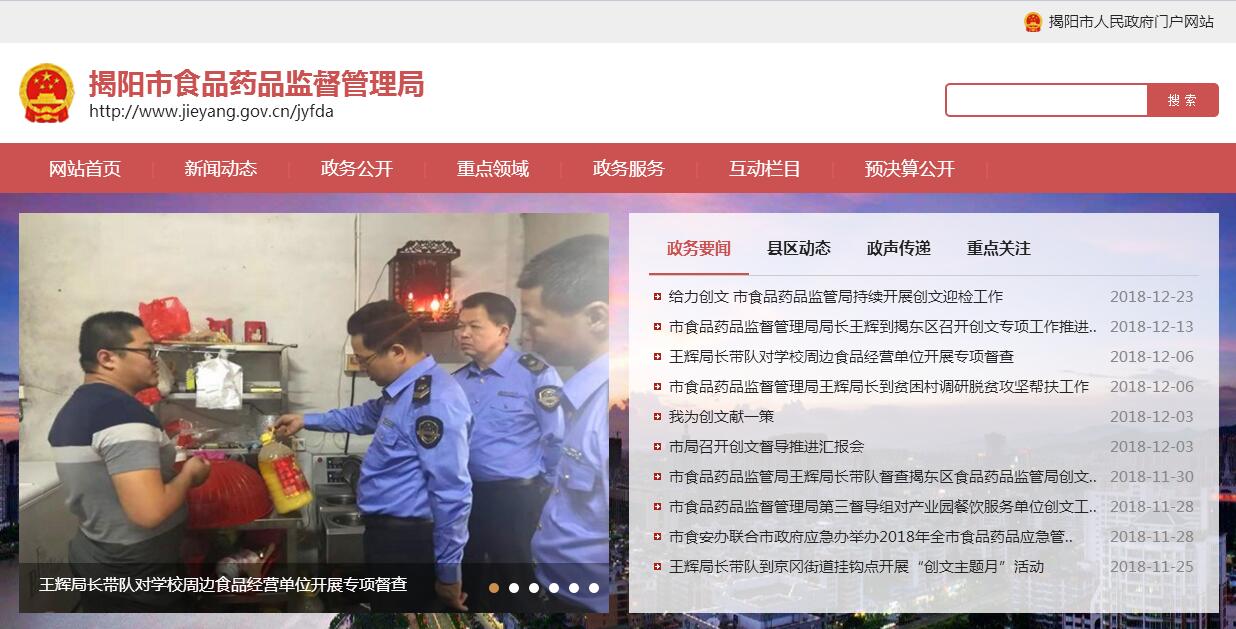 揭阳市食品药品监督管理局主要职责:(一)贯彻执行国家和省有关食品(含食品添加剂、保健食品、酒类食品,下同)安全、药品(含中药、民族药,下同)、医疗器械、化妆品监督管理的方针政策和法律法规,组织制定相关的实施办法并监督实施,推动建立落实食品药品安全企业主体责任、市县(市、区)人民政府负总责的机制,落实食品药品重大信息直报制度,并组织实施和监督检查,着力防范区域性、系统性食品药品安全风险。(二)负责食品的行政许可和监督管理,组织实施食品安全管理规范。建立食品安全隐患排查治理机制,贯彻落实省食品安全检查年度计划、重大整顿治理方案。指导并组织开展食品安全宣传和信息发布工作,组织开展食品安全重大专项治理和综合检查。根据食品安全风险监测计划开展食品安全风险监测工作。(三)监督实施国家药典等药品和医疗器械标准、分类管理制度。监督实施药品和医疗器械研制、生产、经营、使用质量管理规范。协助开展药品、医疗器械注册并监督检查。建立药品不良反应、医疗器械不良事件监测体系,并开展监测和处置工作。配合有关部门实施国家基本药物制度。负责药品、医疗器械、化妆品的行政许可和监督管理,组织实施相关质量管理规范。(四)负责制定全市食品、药品、医疗器械、化妆品监督管理的稽查制度并组织实施,组织查处上述产品研制、生产、流通、使用方面的违法行为。监督实施问题产品召回和处置制度。(五)负责食品药品安全事故应急体系建设,组织和指导食品药品安全事故应急处置和调查处理工作,监督事故查处落实情况。(六)推动食品药品检验检测体系、电子监管追溯体系和信息化建设。(七)负责开展食品药品安全宣传、教育培训工作,推进诚信体系建设。(八)指导各县(市、区)食品药品监督管理工作,规范行政执法行为,完善行政执法与刑事司法衔接机制。(九)指导食品、药品、医疗器械、化妆品的科研实验、临床试验和检验工作,并指导市食品药品检验检测中心的业务工作。(十)承担市食品安全委员会日常工作,负责食品安全监督管理综合协调,推动健全协调联动机制。督促检查市有关部门和县(市、区)人民政府履行食品药品安全监督管理职责并负责考核评价。(十一)承办市人民政府、省食品药品监督管理局以及市食品安全委员会交办的其他事项。