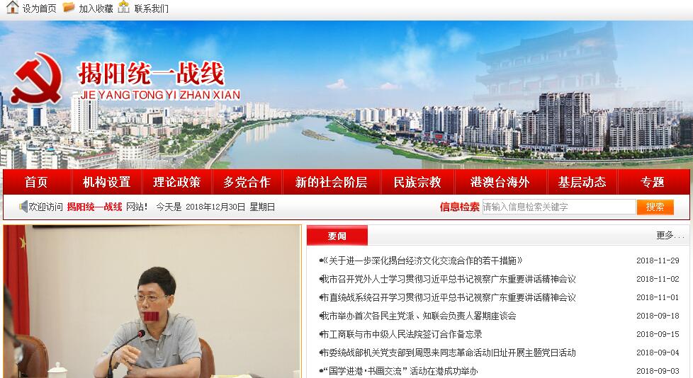 揭阳市委统战部的主要职责是:(一)贯彻执行中央、省委和市委的有关方针、政策;调查研究统一战线的方针、政策的贯彻落实情况,向市委反映统一战线情况,提出统一战线工作的意见和建议;检查统一战线政策执行情况,协调统一战线各方面的关系。(二)负责联系各民主党派和无党派代表人士,通报情况,反映意见和建议;研究、贯彻落实与完善多党合作和政治协商制度以及对民主党派工作的有关方针、政策;落实中央、省委和市委关于发挥民主党派和无党派代表人士参政议政和民主监督作用的工作;为市委与市各民主党派进行政治协商做好组织联络工作;受市委委托,向民主党派、无党派人士通报市委有关指示和会议精神;支持、帮助市各民主党派加强自身建设,选拔培养新一代代表人物;协助有关部门帮助市各民主党派改善工作条件。(三)负责党外人士的政治安排;会同有关部门做好培养、考察、选拔、推荐、安排党外人士担任政府和司法机关领导职务的工作;协同做好党外后备干部和新的代表人物队伍的建设工作,协同做好民主党派、无党派人士代表人士、党外干部的培训工作;协助各民主党派的市委会、市工商联管理干部工作。(四)负责开展以祖国统一为重点的海外统战工作;联系香港、澳门和海外有关社团及代表人士;协调港澳统战工作,归口管理台湾在野党派、政治团体的来访工作,贯彻执行党中央、国务院对台工作方针政策,负责我市对台事务工作,促进与台湾各界人士的交流与合作。联系出国和归国留学人员的有关工作。(五)调查研究并反映非公有制经济代表人士的情况,协调关系,提出政策建议;团结、帮助、引导、教育非公有制经济代表人士,开展思想政治工作。(六)调查研究党外知识分子的情况,反映意见,协调关系;提出政策建议,联系并培养党外知识分子的代表人物。(七)协助有关部门联系海内外宗教团体及其代表人物,联系少数民族代表人物,了解情况,掌握动态,协调关系,提出政策性建议;协助有关部门做好少数民族干部的培养、选拔工作。(八)指导区、县级市党委统战工作和区、县级市、市属高校及有关单位统战部门负责人的培训工作;协调政府各有关部门的统一战线工作;受市委委托,领导市工商联党组,指导市工商联工作;领导市社会主义学院党组,指导市社会主义学院工作;代管市台湾同胞联谊会;指导有关社会团体;联系市政府参事室(文史研究馆)。(九)负责开展海内外统一战线的宣传工作。(十)承办市委和上级统战部门交办的其他事项。