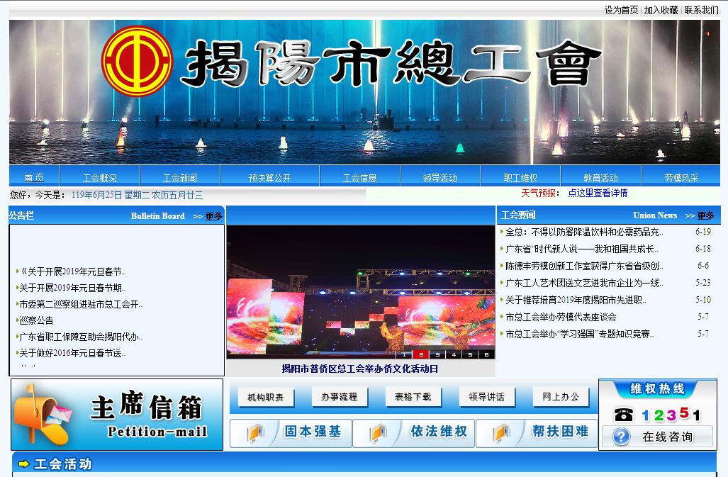 | 网站简介: 根据中央揭阳市委、揭阳市人民政府《关于印发<揭阳市市级党政机构改革方案>和<揭阳市人员编制精简方案>的通知》(揭委发【2001】16号),揭阳市总工会(以下简称总工会)是市委领导的负责工会工作的群众团体。其主要职责:(一)贯彻落实党和国家关于工会工作的方针政策,研究、制订全市工会工作计划和有关规定,并组织实施。(二)指导基层工会参与民主管理,对企事业的劳动、安全、卫生、保护实施职工群众监督检查,依法调处劳动关系。(三)协助有关部门做好职工生活福利和社会保障工作,维护职工合法权益。(四)组织、指导职工开展劳动竞赛、技术革新、合理化建议、职工群众科技活动,做好劳模、先进生产(工作)者及先进集体的评选工作。(五)指导基层工会开展职工的政治思想、文化、技术教育和健康的文体、娱乐活动。(六)指导工会组织建设和干部培训教育工作。(七)管理直属单位,指导市直产业工会工作,为工会经济开展提供业务指导、信息咨询服务。(八)承办市委和省总工会交办的其他事项。(八)承办市委和省总工会交办的其他事项。 |