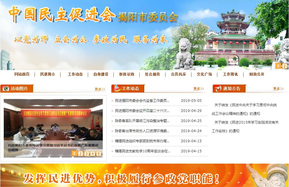 中国民主促进会广东省揭阳市委员会是民进的市级地方组织。1989年4月,民进揭阳县支部成立,隶属民进汕头市委会,罗思聪为支部主任。1991年12月揭阳撤县建市(地级),民进揭阳市支部仍属民进汕头市委会管辖。1996年6月,民进揭阳市委会筹备委员会成立,罗思聪为主任委员。1997年4月,民进广东省揭阳市第一次会员大会召开,选举产生民进广东省揭阳市第一届委员会,许少石为主任委员,民进广东省揭阳市委正式成立。2004年2月、2009年8月和2016年6月,民进广东省揭阳市第二、第三、第四次会员大会召开,许少石任第二届委员会主任委员,陈奇春于2006年7月第二届届中调整为主任委员,并连任第三、第四届委员会主任委员。民进广东省揭阳市第四届委员会现有市委委员13名,设有参政议政工作委员会、教育工作委员会、社会服务工作委员会、妇女工作委员会、会内监督工作委员会、信息工作委员会、经济工作委员会等7个专委会和企业界会员联谊会。机关设办公室1个工作部门。民进广东省揭阳市委自2010年开办会刊《揭阳民进》,每年一期;2015年1月开通民进揭阳市委网站,网址为:www.mjjysw.org.cn。截至2018年1月底,民进揭阳市委下设14个支部,全市会员总数201人,其中教育界104人,文化艺术界5人,中高级职称会员 123 人,占61.2%。会员中有各级人大代表 7人次,各级政协委员32人次,在机关、事业单位担任科级及以上职务的 27 人(其中:厅处级 11 人)。成立二十年来,民进揭阳市委在民进中央、民进广东省委和中共揭阳市委的领导下,在中共揭阳市委统战部的指导和帮助下,紧紧围绕市委、市政府中心工作和重大民生问题,切实履行政治协商、参政议政、民主监督职能,为揭阳的社会和经济发展作出了应有的贡献。