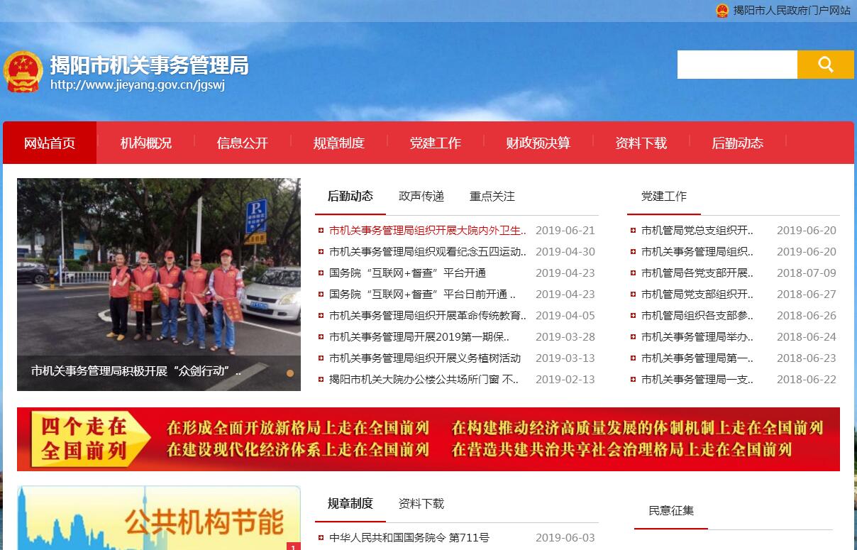 揭阳市机关事务管理局主要职责:1、负责市副厅级以上领导干部的生活保障和办公用房、工作住房的管理、修缮工作;2、负责市委、市政府办公大院的水、电、电话、食堂、环境卫生、园林绿化等的管理;3、负责市委、市政府办公大楼与干部职工周转房的建设、修缮和管理;负责市政府干部住宅区的管理;受市政府委托,对市政府交纳地价款的建设用地土地使用权的有关证件、资料的管理;4、负责市委、市政府办公大院的安全保卫、消防工作,加强对进出市委、市政府办公大院的车辆管理工作;承办市委、市政府举办的重大活动和各种重要会议的安全保卫、车辆调度工作;负责市政府各住宅小区的社会治安综合治理和消防工作;协调市武警支队做好驻市委、市政府警卫分队的安全警卫工作;5、负责对市委、市政府办公大院内各大、中会议场所、接待场所的使用安排、管理、维修和服务工作;6、负责提供市厅级退休领导干部的用车服务;7、依法负责全市公共机构节能监督管理工作;8、负责组织实施机关后勤体制改革,管好机关后勤服务机构,创办机关经济实体,对市直机关和县(市、区)机关后勤事务工作实行行业指导,努力促进全市机关后勤管理科学化、服务社会化和保障法制化;9、负责做好榕江大型音乐喷泉的管理工作;10、承办市委、市政府交办的其他事项。