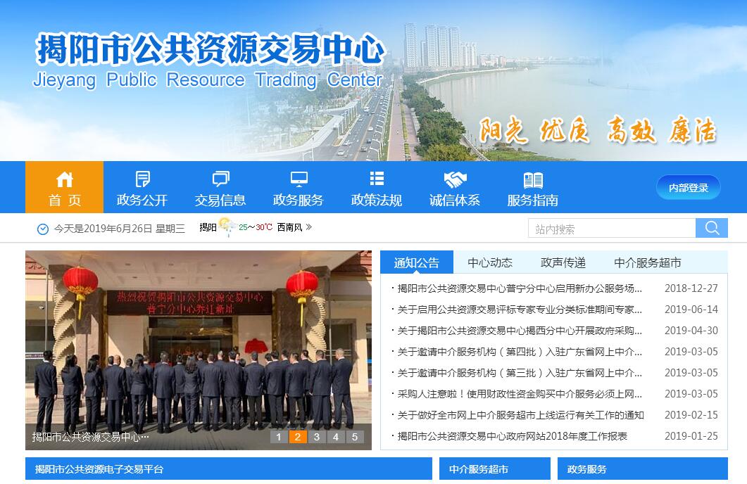 揭阳市公共资源交易中心为揭阳市人民政府综合政务服务管理办公室(加挂揭阳市公共资源交易管理办公室牌子)管理的公益一类事业单位,不定级别。由原揭阳市土地与矿业交易中心、揭阳市建设工程交易中心、市政府采购中心和普宁市、揭东区、揭西县、惠来县公共资源交易中心整合而成。中心核定事业编制90名,其中主任1名(副处级)、副主任7名(正科级、兼任各部部长);内设机构正副部长14名(部长7名,由副主任兼任;副部长7名,副科级)。下设普宁、揭东、揭西、惠来4个分中心,作为分支机构,副科级建制,隶属揭阳市公共资源交易中心垂直管理。其主要职责:(一)根据国家、省、市有关法律、法规和政策,制定公共资源进场交易各项业务操作规程,建立和完善内部管理制度。(二)负责管理全市公共资源交易业务工作。(三)负责全市公共资源交易平台、专家库、公共资源数据系统的建设、维护和管理工作。(四)为各类公共资源交易活动提供规范的场所、设施和服务。(五)依法开展政府采购、土地使用权和矿业权交易、建设工程招投标交易、产权交易等业务活动;维护公共资源交易中心的交易秩序。(六)检验市场主体、中介机构资格及进场交易项目资料。(七)为公共资源交易主体提供信息咨询服务;为公共资源交易行政监督工作提供监管平台,及时向有关部门报告并协助调查违法违规交易行为。(八)依法成立项目评审委员会,并按照规程组织项目评审、公开发布评审结果。(九)建立公共资源现场交易信用和纪律档案;收集、存储和发布公共资源交易信息;见证公共资源进场交易全过程,确认交易结果;整理、保存交易过程中的相关资料备查。(十)组织协调有关部门对全市公共资源交易活动进行监管,协助处理公共资源交易投诉。(十一)承办上级部门交办的其他各项任务。