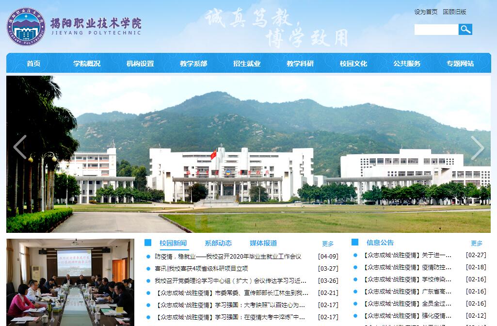 揭阳职业技术学院建于1999年,是揭阳市唯一的公办全日制高等院校,位于揭阳市榕城区紫峰山桂竹园风景区,交通便捷。紫峰木铎, 钟灵毓秀,俊采星驰。建校16年来,全体学院人在省教育厅和揭阳市委市政府的正确领导下,全面贯彻党的教育方针,坚持以服务为宗旨,以就业为导向,为揭阳市乃至全省各行业培养了高素质技能人才逾20000人,成为特色鲜明、具有一定影响力的区域性高等职业院校。学院现设有电子商务创业学院、思想政治理论课教学部、师范教育系、外语系、信息工程系、机电工程系、生物工程系、化学工程系、艺术与体育系、经济管理系10个院系(部),有全日制在校生7700多人。已培养十三届毕业生,就业率均达98%以上,毕业生受到用人单位的普遍欢迎。我院专业特色鲜明,2015年有招生专业35个,其中师范类专业13个,非师范类专业22个,面向广东等8个省(自治区)招生。有多个专业与国内知名企业联合办学,毕业生可优先到企业就业。现有3个省级实训基地和2门省级精品课程,宝玉石鉴定与加工技术、模具设计与制造2个专业被省教育厅列为省级重点培养专业,英语教育、电气自动化技术2个专业获得中央财政支持建设,固体药物制剂GMP仿真车间和电子商务专业培训与创业孵化2个项目获中央财政奖补资金支持。学院师资结构合理,素质优良。现有在编教职工386人,其中正高职称7人,副高以上职称89人,具有硕士以上学位教师136人。弘文励教,砥砺奋进,教学水平高。学院图书馆藏书78万册,其中电子图书36万册;报纸期刊近1000种。校内有102间实验实训室和3个创业基地,在珠三角及粤东等地都设有校外实训和创业基地。校内建有国家职业技能鉴定所、高新技术考证站、普通话培训测试站,提供20多个职业技能鉴定工种的初、中、高等级的鉴定和资格认证服务,为学生培训、考证提供便捷服务。学院已通过教育部高职高专院校人才培养工作水平评估及回访,先后被评为 “广东省先进基层党组织”、“广东省文明单位” 及“2008—2010年度广东省高校治安综合治理优秀学校”,被授予“国家节约型公共机构示范单位”、“广东省社会科学普及先进示范基地”、“全国教育网络示范单位”和“全国管理资格国际双认证授权培训中心”等。近年来,学院凝心聚力、奋发图强、真抓实干、勇抓机遇、加快发展,以办成“粤东职业教育的领头羊、省示范性高等职业院校”为办学目标,努力提高“区域化、市场化、开放化、品牌化”办学水平,把协同创新作为发展动力,把合作办学作为有效途径,把大学文化作为深厚土壤,使学院成为培养高素质技能人才的高地,毕业生就业前景广阔。