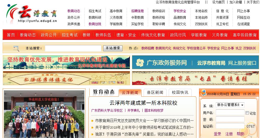 云浮市教育局于1994年9月28日设立(时称云浮市教育委员会,1997年1月20日后称云浮市教育局),正处级单位,是云浮市人民政府主管教育事业的工作部门。现设有办公室(挂市语言文字工作委员会办公室牌子)、基建计财科、基础教育科、体育卫生与艺术教育科、职业与成人教育科、人事科、招生考试办公室、教育督导室(挂市人民政府教育督导室牌子)、德育科等9个行政科室,以及教研室、教学仪器站、市教育信息中心、成人教育中心等4个直属事业单位。工作人员共55人,其中行政机关工作人员(含派驻纪检组)33人,事业单位工作人员22人。“云浮教育”网站是云浮市教育局的公众门户网站,具体由信息中心负责建设及技术支持工作,办公室及其他各业务科室负责网站内容的日常更新管理工作。“云浮教育”网站是一个综合、开放、多功能的大型教育信息门户网站。网站的英文域名为“yunfu.edugd.cn”,中文网址为“云浮市教育局.政务”。“云浮教育”网站建成开通以来,取得了良好的社会效益,倍受国内外关注,在教育行政部门与人民群众之间架起了一座沟通的桥梁。电子政务平台的广泛使用,使教育局机关工作高效规范。各种查询系统的开通为广大学生和市民提供及时、准确的教育信息。丰富的教育教学资源网站为师生提供教与学的园地。网络教学平台广泛应用在教师培训和学生学习辅导中,为教师继续教育提供全天候的学习服务。“云浮教育”网站的建设和运作模式,受到多位教育专家和众多地市关注,在云浮教育教学和教育管理中发挥着重要的作用。“云浮教育”网站着力体现“服务教育”和“便民利民”的特色:·教育信息——第一时间发布我市教育新闻,各县(市、区)及直属学校教育动态,并及时提供丰富的、广大市民所关心的各类教育信息(招生考试、教师招聘、招标采购等);·网上办事——提供办事指南、教育行政事项预审批、办事状态查询等服务,打造一站式的教育服务平台;·教学资源——为全市师生提供结构合理、科学规范、内容丰富的教学资源、教育视频及教学应用系统平台;·互动平台——网上业务咨询、信访投诉、建议、教育博客等为您提供网上沟通的渠道,与教育部门的互动交流更为方便、快捷、全面;·网站导航——为您提供全市教育网站、政府部门网站和常用热门网站的导航链接。目前,“云浮教育”网站共设有“教育动态”、“政务公开”“招生考试”、“云浮教研”、“教师队伍”、“政风行风”、“德育 安全”、“三网融合教育应用实验”、“学前教育”、“义务教育”、“高中阶段教育”、“教学资源”等12个一级栏目。主要的特色栏目有:“教育动态”、“政务公开”“招生考试”、“云浮教研”、“教师队伍”、“政风行风”、“德育 安全”等。