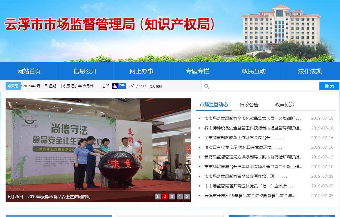| 网站简介: 云浮市市场监督管理局是根据《中共中央关于深化党和国家机构改革的决定》和《云浮市机构改革方案》整合组建的市政府工作部门,我市将市工商行政管理局、市质量技术监督局、市食品药品监督管理局(市食品安全委员会办公室)的职责,以及市科学技术局(市知识产权局)的专利管理职责,市发展和改革局的价格监督检查和反垄断执法职责,市商务局的经营者集中反垄断相关职责等整合,组建市市场监督管理局,加挂市知识产权局牌子。市食品安全委员会的具体工作由市市场监督管理局承担。2019年1月30日,云浮市市场监督管理局(知识产权局)正式挂牌。 |