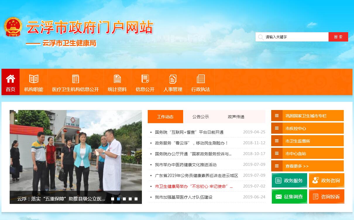 云浮市卫生健康局主要职责:(一)贯彻执行卫生健康事业发展的法规、规章和政策、规划,组织实施有关标准和技术规范。统筹规划卫生健康资源配置,指导区域卫生健康规划的编制和实施。负责全市卫生健康系统安全生产相关工作。制定并组织实施推进卫生健康基本公共服务均等化、普惠化、便捷化和公共资源向基层延伸等政策措施。(二)协调推进深化医药卫生体制改革,研究提出深化医药卫生体制改革政策、措施的建议。组织深化公立医院综合改革,推进管办分离,健全现代医院管理制度,制定并组织实施推动卫生健康公共服务提供主体多元化、提供方式多样化的政策措施,提出医疗服务和药品价格政策的建议。(三)制定并组织落实重大疾病防治规划以及严重危害人民健康公共卫生问题的干预措施,组织实施免疫规划。负责卫生应急工作,组织指导突发公共卫生事件的预防控制和各类突发公共事件的医疗卫生救援。(四)组织拟订并协调落实应对人口老龄化政策措施,负责推进老年健康服务体系建设和医养结合工作。(五)组织落实药物政策,落实国家基本药物制度,开展药品使用监测、临床综合评价和短缺药品预警,提出基本药物价格政策的建议。组织开展食品安全风险监测评估,组织实施食品安全地方标准。(六)负责职责范围内的职业卫生、放射卫生、环境卫生、学校卫生、公共场所卫生、饮用水卫生等公共卫生的监督管理,负责传染病防治监督,健全卫生健康综合监督体系。组织开展爱国卫生运动。(七)负责医疗机构、医疗服务行业管理办法的监督实施,建立医疗服务评价和监督管理体系。会同有关部门制定并实施卫生健康专业技术人员资格标准。组织实施医疗服务规范、标准和卫生健康专业技术人员执业规则、服务规范。(八)负责计划生育管理和服务工作,开展人口监测预警,研究提出人口与家庭发展相关政策建议,组织实施计划生育政策。(九)指导县(市、区)、镇(街)卫生健康工作,指导基层医疗卫生、妇幼健康服务体系和全科医生队伍建设。推进卫生健康科技创新发展。(十)负责保健对象的医疗保健工作,负责重要会议与重大活动的医疗卫生保障工作。(十一)研究拟订全市卫生健康人才发展政策并组织实施,推动高素质专业化卫生健康人才队伍建设,加强卫生健康人才下沉基层。(十二)管理市中医药局,推动中医药强市建设。(十三)完成市委、市政府和省卫生健康委交办的其他任务。