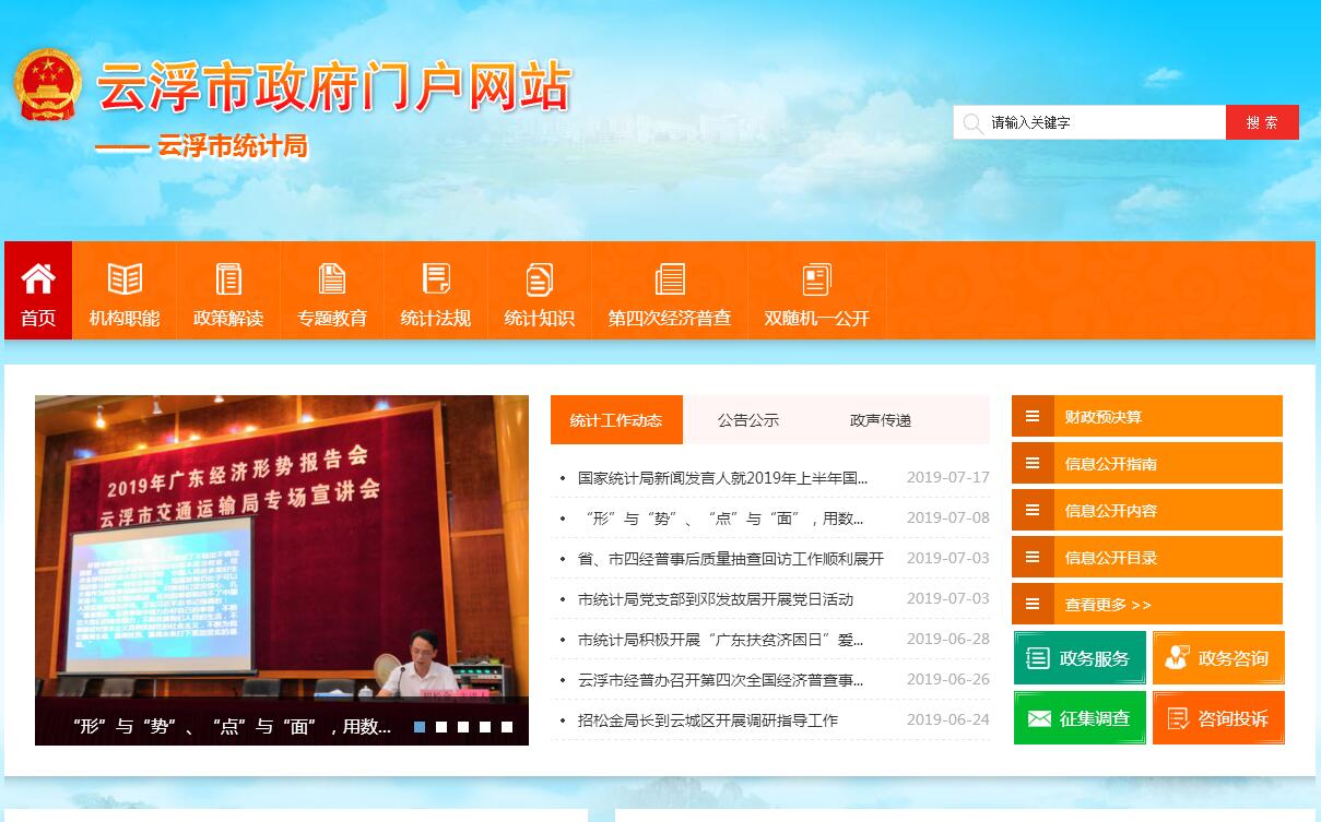云浮市统计局是主管全市统计和国民经济核算工作的市人民政府直属机构。其主要职责是:(一)贯彻执行国家和省有关统计工作的方针政策和法律法规;承担组织和协调全市统计工作,确保统计数据真实、准确、及时;监督检查统计法律、法规和制度的实施,指导全市统计工作。(二)拟订地方统计报表制度,组织实施全市及各地区国民经济核算制度和投入产出调查,核算全市及各地区生产总值,提供国民经济核算资料,监督管理全市各地区国民经济核算工作。(三)组织实施全市人口、经济、农业等重大市情市力普查,汇总、整理和提供有关市情市力方面的统计数据。(四)组织实施农林牧渔业、工业、建筑业、批发和零售业、住宿和餐饮业、房地产业等统计调查,收集、汇总、整理和提供有关调查的统计数据,综合整理和提供地质勘查、旅游、对外经济、交通运输、邮政、教育、卫生、文化、体育、司法、社会保障、公用事业等全市性基本统计数据。(五)组织实施能源、投资、科技、人口、劳动力、社会发展基本情况等统计调查,收集、汇总、整理和提供有关调查的统计数据。(六)组织全市各地区、各部门的经济、社会、科技和资源环境统计调查,统一核定、管理、公布全市性基本统计资料,定期发布全市国民经济和社会发展情况的统计信息。(七)对国民经济、社会发展等情况进行统计分析、统计预测和统计监督,向市委、市政府及有关部门提供统计信息和咨询建议。(八)依法审批市直各部门的统计调查项目,指导专业统计基础工作、统计基层业务基础建设,建立健全统计数据质量审核、监控和评估制度,开展对重要统计数据的审核、监控和评估。(九)指导全市统计专业技术队伍建设,会同有关部门组织管理全市统计专业技术资格考试、从业资格认定工作。(十)建立并管理全市统计信息化系统和统计数据库系统,指导各地区、各部门统计数据库和网络的基本标准和运行规则的实施工作,指导全市统计信息化系统建设。(十一)配合有关部门开展《经济社会科学发展评价指标体系》的计算和评估工作。(十二)承办市人民政府和省统计局交办的其他事项。