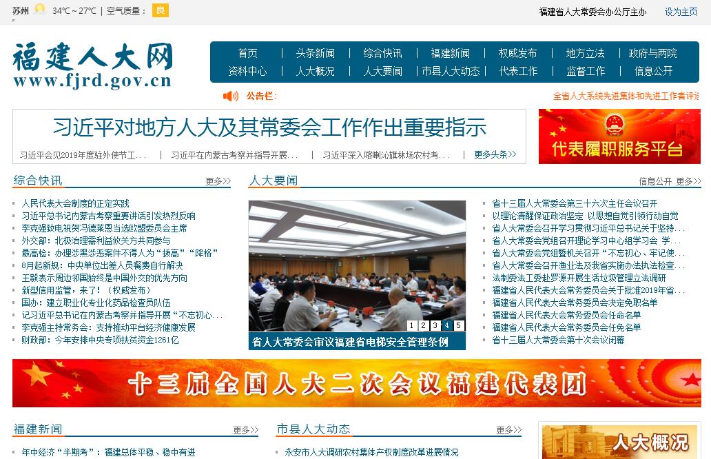 福建省人民代表大会及其常务委员会是福建省的政府机关。《中华人民共和国宪法》规定,地方各级人民代表大会是地方国家权力机关。县级以上的地方各级人大常委会,是本级人民代表大会即地方国家权力机关的常设机关。《地方各级人民代表大会和地方各级人民政府组织法》规定,县级以上的地方各级人民代表大会行使 15 项职权,各级人民代表大会常务委员会行使 14 项职权。人大及其常委会的主要职权通常又被概括为“四权”:立法权、监督权、重大事项决定权和人事选举任免权。立法权。自福建省人大及其常委会于 1979 年、福州市人大及其常委会于 1982 年、厦门市人大及其常委会于 1994 年分别拥有地方立法权以来,我省形成了省级立法、较大的市立法和特区立法组成的地方立法格局。近三十年来,省人大及其常委会切实加强立法工作,提高立法质量,坚持把立法同改革发展稳定的重大决策紧密结合起来,根据地方立法“不抵触、有地方特色和时代精神、可操作”的要求,适时制定和完善有关地方性法规,有力地保障和促进了我省改革开放和各项事业的发展。从 1979 年底至 2008 年 5 月,共审议通过地方性法规 242 项,修改地方性法规 97 项,废止地方性法规 58 项,现行有效地方性法规 184 项;福州市人大及其常委会制定的现行有效地方性法规 60 项;厦门市人大及其常委会制定的现行有效地方性法规 73 项,其中,经济特区法规 53 项,较大的市法规 20 项。监督权。人大监督工作可分为法律监督、工作监督。法定监督方式主要包括视察、听取和审议工作报告、执法检查、询问、质询、撤职、罢免、特定问题调查、预算审查监督、规范性文件的备案审查等。近三十年来,省人大及其常委会根据宪法法律赋予的职权,就经济社会发展中的一些重大问题、人民群众普遍关心的问题和社会反映强烈的问题,开展形式多样的监督活动。先后听取和审议一府两院的工作报告 500 多项,对 200 多部法律法规的执行情况进行了检查监督,解决了法律法规实施中的一些重要问题。省人大在运用质询等具有较强约束力的监督形式方面也有一些成功的实践。重大事项决定权。人大常委会集体行使职权、集体决定问题。将地方重大事项和党的主张通过法定程序成为国家意志,既可以有效地减少地方重大事项决策的失误,也可以使决策真正体现本行政区域人民群众的意志和利益。这也是加强和改善党的领导,实现人民当家作主的重要环节。近三十年来,省人大及其常委会紧紧围绕中心、服务大局,根据经济、政治、文化建设的需要,认真行使重大事项决定权,共作出了 310 多项决议决定。如 2005 年初,省人大常委会提请省十届人大三次会议作出了关于促进海峡西岸经济区建设的决定,把省委的决策转化为全省人民的意志,进一步明确我省各级国家机关的职责,更好地凝聚各方面的智慧和力量,促进了海峡西岸经济区建设。人事选举任免权。依照法定的权限与程序,选举、任命和免去本级国家权力机关的常设机关以及行政机关、审判机关、检察机关成员的公职,这是人民当家作主的重要体现,是管理地方国家事务的重要保证。选举权属于省人民代表大会。任免权属于省人大常委会。省人大及其常委会对由其产生的国家机关工作人员,有罢免、免职、撤职和接受辞职四种去职方式。近三十年来,根据宪法和法律的规定,地方选举工作进行了改革与完善,实行县、乡两级人大代表直接选举;实行选民、代表联合提名候选人;实行普遍差额选举。在依法做好选举工作的同时,省人大常委会还认真做好人事任免工作。近三十年来,共任免人大机关工作人员 290 多人次,政府组成人员 590 多人次,审判人员 1140 多人次,检察人员 1570 多人次,为地方国家机关的正常运转和我省改革发展稳定提供了组织保证。省人大及其常委会还对如何行使好选举任免权进行了积极探索与完善。