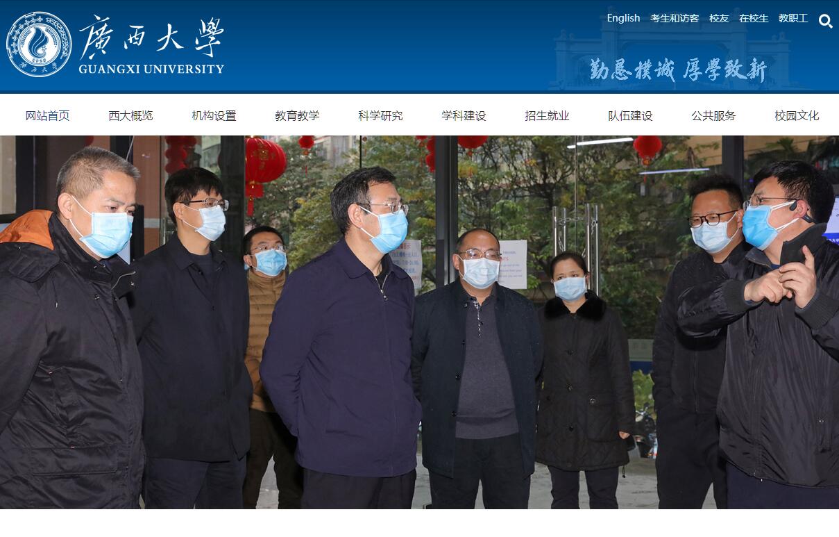 八桂之南、边海之交、邕江之畔、绿城之中,广西大学坐落于风景如画的广西首府南宁,是广西办学历史最悠久、规模最大的综合性大学,是广西唯一的国家“211工程”建设学校,中西部高校提升综合实力计划建设高校、世界一流学科建设高校和“部区合建”高校。学校创办于1928年,1939年成为国立广西大学。1950年与南宁师范学院合并。1951年,与西江学院本科部合并。1952年,毛泽东主席亲笔题写“广西大学”校名。同年,广西大学农学院独立建制,成立广西农学院。1953年,广西大学在全国高校院系调整中被停办。1958年,广西大学恢复重建。1961年,广西工学院和广西科技学院并入广西大学。1962年,广西林学院并入广西农学院。1970年,广西劳动大学并入广西农学院。1992年,广西农学院更名为广西农业大学。1997年,广西大学与广西农业大学合并,组建新的广西大学。广西大学首开广西高等教育之先河,首任校长是有着教育界“北蔡南马”之称的“一代宗师”,我国著名教育家、科学家、民主革命家马君武博士。国立广西大学时期,竺可桢、李四光、陈望道、陈寅恪、王力等一批名家曾在这里任教,是当时国内有较大影响的综合性大学之一。1953年全国高校院系调整时,广西大学师生、学科专业以及设备和图书资料被调整到中南和华南地区的19所大学,为新中国高等教育的发展作出了重大贡献和牺牲。两校合并以及进入“211工程”,使广西大学迈上了创建高水平大学的新征程。特别是十八大以来,学校改革发展取得一系列重大标志性成果:顺利完成中西部高校提升综合实力计划,国家重点实验室建成并获得评估通过,再次获得国家科技进步奖二等奖,4个学科进入ESI全球学科排名前1%,进入国家世界一流学科建设高校,入选全国文明单位、全国高校就业工作50强、全国高校创新创业工作50强、全国首批深化创新创业教育改革示范高校等,学校各项事业欣欣向荣、蓬勃发展。在90年的办学历程中,广西大学秉持“勤恳朴诚”的校训,积累和沉淀了鲜明的办学特色、深厚的人文底蕴和独特的西大精神。学校占地面积2.16万余亩,其中扶绥农科基地(农林动科研教学实验基地)占地面积16898.3亩,校舍总建筑面积170多万平方米。教学科研设备总值17.06亿元,图书馆实体馆藏总量386万余册(件),电子图书595万册,电子期刊3.5万种,中外文数据库182个。学科门类齐全,涵盖哲、经、法、教、文、理、工、农、医、管、艺等11大门类,有98个本科专业(2017年招生专业(类)64个,其中9个大类)。下设27个学院,在校全日制本科生26768人、全日制研究生8050人、留学生及港澳台生2050人,各类在读继续教育学生41998人,在站博士后研究人员123人。现有在职在编教职工3662人,其中具有正高级专业技术职务618人、副高级专业技术职务1112人,专任教师2070人。现有1个国家“双一流”建设学科群,2个国家重点学科,1个国家重点(培育)学科;有17个一级学科博士点,40个一级学科硕士点,45个专业(领域)硕士点和10个博士后科研流动站。有1个国家重点实验室、1个省部共建国家重点实验室培育基地和1个国家级国际科技合作基地,3个教育部重点实验室和工程研究中心,1个教育部国别和区域研究基地,1个国家林业局重点实验室,和一批广西重大科技创新基地、重点实验室、工程技术研究中心、农业良种培育中心等。有4个广西“2011协同创新中心和培育基地”,1个广西人文社会科学重点研究基地、6个广西高校人文社会科学重点研究基地。学校坚持社会主义办学方向和立德树人根本任务,以提高人才培养质量为核心,不断深化教育教学改革,教学发展和改革取得了一系列标志性成果。2007年至今共获得教育部“质量工程”建设项目、“本科教学工程”项目共61项,获得项目数居地方“211工程”高校前列。其中国家特色专业12个,国家精品课程3门,国家级双语教学示范课程2门,国家级教学团队3个,国家教学名师2人,国家级专业综合改革试点专业4个,国家级精品开放课程7门,国家级人才培养模式创新实验区1个,国家级大学生校外实践教育基地5个,7个国家级实验教学中心,27个自治区级实验教学中心,15个专业入选教育部“卓越工程师教育培养计划”、“卓越法律人才教育培养计划”和“卓越农林人才教育培养计划”。学校培养的毕业生专业基础扎实、综合素质高、社会适应能力强,得到社会和用人单位的肯定和欢迎。学校连续13年获得“广西普通高校毕业生就业工作先进单位”称号。广西大学KAB创业俱乐部荣膺全国十佳。90年来,学校为国家和社会培养了40多万名各类专业人才,其中李林、党鸿辛、陈太一、沈善炯、卢鹤绂、文圣常、施汝为、韩斌等8位校友当选为两院院士;还有许多校友成长为各级党委、政府部门的领导,各行各业的专家、骨干和地方经济建设的主力军。学校着力提高教师水平和质量,加大高层次人才培养和引进力度,造就了一支品德高尚、业务精湛、结构合理、充满活力的高素质教职工队伍。现有院士1人、双聘院士6人、“973”项目首席科学家1人、国家“千人计划”特聘教授3人、“万人计划”领军人才5人、教育部“长江学者特聘教授”5人、教育部“长江学者讲座教授”1人、国家“杰出青年基金”获得者3人、国家“百千万人才工程”人选10人、国家“杰出专业技术人才”2人、中国科学院“国外引进杰出人才”(百人