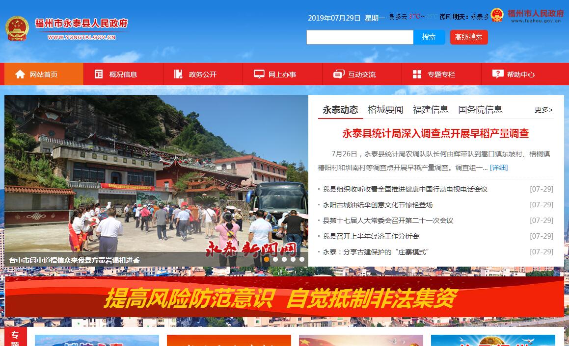 | 网站简介: 永泰县(古属福州府永福县)为福建省福州市辖县,位于福建省东部,东经118度23分至119度12分,北纬25度39分至26度05分之间,东邻福州闽侯、福清,西接泉州德化、尤溪,南连莆田涵江、仙游,北接福州闽清县。全县辖樟城、城峰、清凉、葛岭、梧桐、嵩口、长庆、大洋、同安9个镇,塘前、丹云、白云、富泉、岭路、赤锡、伏口、盖洋、东洋、霞拔、盘谷、红星12个乡,255个村,12个社区。县政府驻地为樟城镇。2018年9月,荣获“中国天然氧吧”称号。 |