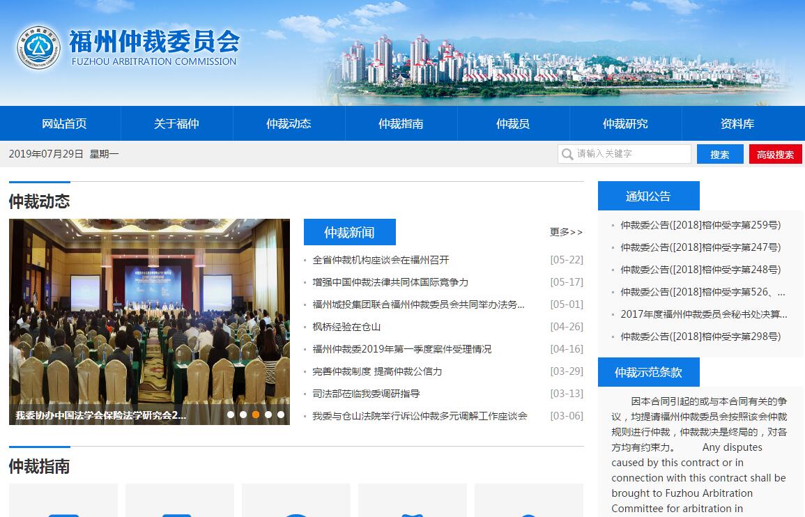 福州仲裁委员会是依据《中华人民共和国仲裁法》组建,经福州市人民政府于一九九六年七月批准设立,并经福建省司法厅登记的仲裁机构。成立以来,每年受理大量的平等主体的公民、法人和其他组织之间的合同纠纷和其他财产权益纠纷,涵盖买卖、借贷、金融、保险、争取、土地出让、房地产开发、建设工程、投资贸易、股权转让、知识产权、教育培训、商标广告等众多领域,深受各类市场经济主体的认可。二十多年来,福州仲裁委员会始终坚持以人为本,全力打造“公正、专业、廉洁、高效”的福州仲裁品牌。我们有一支专业水平高、公道正派的优秀仲裁员队伍,仲裁员既有台湾地区的知名学者、律师;既有知名法学研究机构的研究员,又有全省知名律师;既有省直市直有关法规部门负责人,又有资深经贸专家。我们有一支朝气蓬勃、专业高效、法学本科学历以上的办案秘书队伍。我们与省内高校的交流合作十分密切,挂牌成立福州大学教学科研实践基地、福建警察学院省级校外实训基地等,经常性开展法律热点、难点问题研讨。福州仲裁委员会已先后成立福建省保险仲裁中心、消委会办事处、医药食品仲裁中心、养老仲裁中心、证券期货仲裁中心、互联网金融仲裁中心、福州国际商事仲裁院、仓山分会、涉侨仲调工作室、莆田中心,将继续加强省会仲裁对周边的辐射带动,努力发展海西省会中心城市仲裁事业,及时、公正解决民商事纠纷,促进社会主义市场经济的和谐、稳定发展。