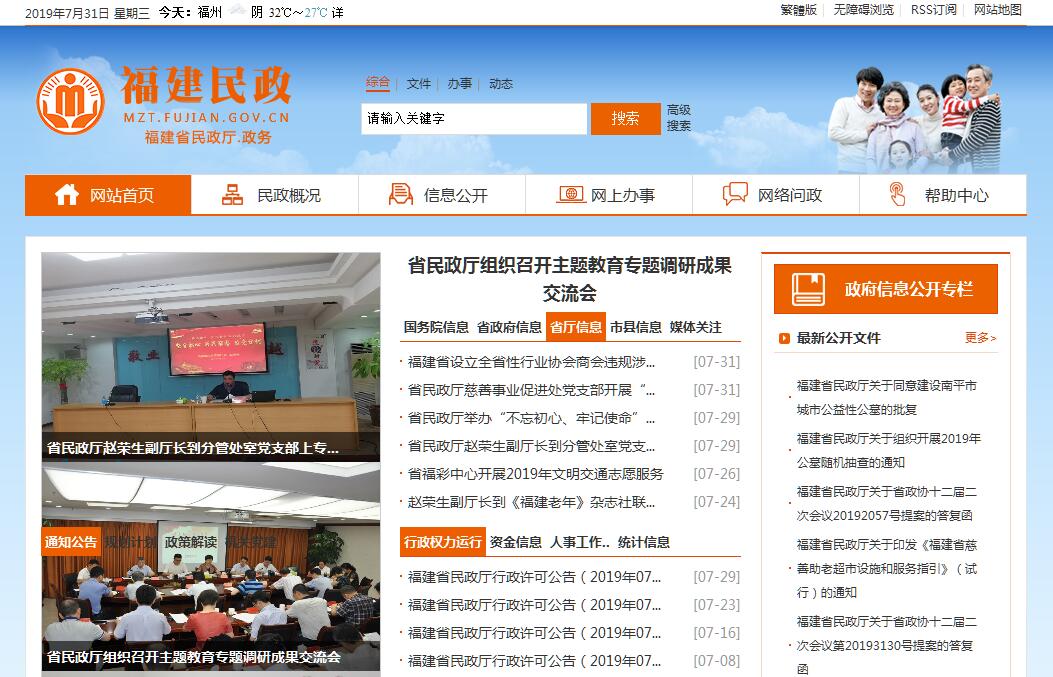 福建省民政厅主要职责:(一)贯彻执行国家有关民政工作的法律法规和政策,起草并组织实施我省民政工作的地方性法规、规章和政策,拟订并组织实施全省民政事业发展规划。(二)承担对社会团体、基金会、民办非企业单位进行登记管理和监察的责任,指导全省民间组织登记管理工作。(三)负责组织指导军队退役士兵、转业士官、复员干部、离退休干部和无军籍退休退职职工的接收安置工作,拟订和协调落实有关优抚、安置政策,负责烈士褒扬工作,组织和指导拥军优属工作,承担省双拥共建工作领导小组的日常工作。(四)负责组织协调救灾工作,负责组织核查、上报和发布灾情,管理、分配中央和省级救灾款物并监督使用,组织指导救灾捐赠和有关防灾减灾工作,牵头组织实施政策性农村住房保险。(五)牵头拟订社会救助规划和政策,健全城乡社会救助体系,负责城乡居民最低生活保障、医疗救助、临时救助、农村五保供养和城市生活无着人员救助工作。(六)拟订城乡基层群众自治建设和社区建设政策并组织实施,指导社区服务体系建设,提出加强和改进基层民主政治建设的建议,推动基层民主政治建设。(七)负责省内各级行政区域的设立、撤销、更名及政府驻地迁移的审核报批工作,组织指导全省各级行政区域界线的勘定和管理,指导地名管理工作。(八)拟订社会福利事业发展规划和政策并组织实施,负责社会福利事业机构的管理,按规定负责全省福利彩票销售和资金管理工作,组织指导社会捐助工作,会同有关部门研究落实促进慈善事业发展的政策措施,指导老年人、孤儿和残疾人等特殊群体的权益保障工作。(九)指导全省婚姻登记管理、儿童收养登记管理工作,办理并指导涉外和涉港、澳、台、侨的婚姻登记及儿童收养登记工作,推进婚俗改革。(十)负责全省殡葬管理,推行殡葬改革,指导殡葬服务机构管理工作。(十一)指导全省革命老区建设工作,协调扶持革命老区经济社会发展,协调办理涉及老区的事务,负责革命“五老”人员优待管理工作,联系和指导省老区建设促进会工作。(十二)会同有关部门拟订社会工作人才队伍建设规划和相关政策,指导社会工作人才队伍和相关志愿者队伍建设。(十三)承办省委、省政府交办的其他事项。