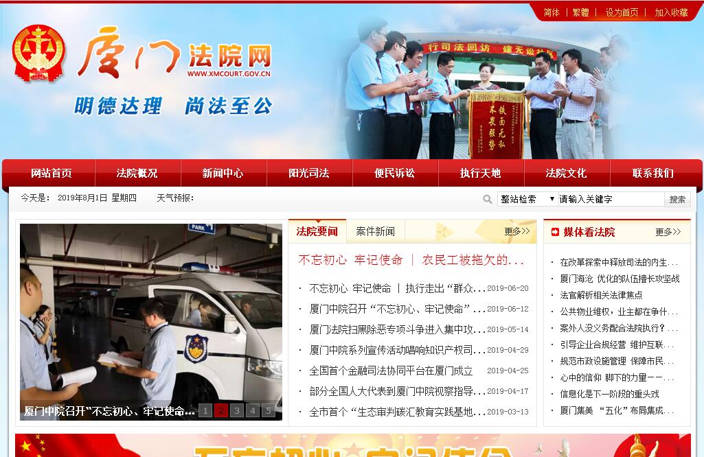 厦门市中级人民法院成立于1957年11月,其前身系于1950年1月组建的厦门市人民法院。目前下辖思明区、湖里区、集美区、海沧区、同安区、翔安区6个基层人民法院和16个人民法庭。司法辖区厦门市总面积1573平方公里,常住人口373万。厦门市两级法院现有干警910名,其中法官524名;市中院干警242名,其中法官135名。厦门中院目前内设办公室、审判管理办公室、立案一庭、立案二庭、刑事审判第一庭、刑事审判第二庭、民事审判第一庭、民事审判第二庭、民事审判第三庭、民事审判第四庭、民事审判第五庭、涉台案件审判庭、行政审判庭、审判监督庭、执行局、研究室、司法行政装备管理处、司法鉴定技术处、法官培训处、干部处、宣传教育处、秘书处、监察室、机关党委、法警支队25个职能处室和市法官协会。厦门市两级法院近五年平均年受理案件6.6万余件,其中中院8500余件。2014年全市法院受理案件78951件,其中中院10393件。近几年来,厦门中院在党委领导和上级法院指导下,成功审结了最高法院指定管辖的江苏省委原常委、原组织部长徐国健受贿案、山东省委原副书记、青岛原市委书记杜世成受贿案、浙江省人大原副主任张家盟受贿案、赖昌星走私普通货物、行贿案以及福建省第一件上市公司破产重整案——夏新电子破产重整案、大陆第一件认可台湾地区刑事附带民事和解笔录案、第一件认可台湾仲裁机构裁决案等一批大案要案。全市法院相继有1个案例入选“2012年度人民法院十大典型案件”、2个案例入选“全国法院践行能动司法理念优秀案例”、1个案例入选首届“全国法院十大调解案例”、 3个案例分别入选2012年和2013年度“中国法院知识产权司法保护50件典型案例”、2个案例入选“人民法院涉台司法互助典型案例”。多年来,厦门两级法院紧紧围绕公正高效司法,在司法改革领域开展了一系列积极的探索:2001年,思明区法院敲响了大陆法院 庭审第一槌。2003年,湖里区法院在全国法院率先开发使用执行案件信息管理系统。2008年,厦门中院、海沧区法院、同安区法院分别被最高法院确定为量刑规范化改革试点单位、司法改革联系点法院和多元纠纷解决机制改革项目试点法院。2009年,厦门中院推广翔安区法院在小嶝岛创建“好厝边会所”的成功经验,在全市两级法院部署开展“无讼社区”创建活动,得到上级领导的批示肯定并在全省法院推广。2010年,海沧区法院被最高法院确定为全国司法公开工作第一批示范法院。2011年,厦门中院和思明区法院获得最高法院批准开展知识产权刑事、民事、行政审判“三合一”试点工作;思明区法院被最高法院确定为“小额速裁”改革试点法院;海沧区法院获准实行涉台审判集中管辖司法改革项目。2012年,厦门中院被最高法院确定为诉调对接机制改革试点法院;海沧区法院成立全国首个涉台法庭。 2013年,厦门中院成立涉台案件审判庭,在全国首创两级法院涉台民事、刑事、行政案件集中管辖工作机制;湖里区法院被福建高院确定为审判综合改革试点法院。2014年,厦门中院和思明区法院分别被最高法院确定为企业破产案件审理方式改革试点法院和全国司法公开改革试点法院。2015年,厦门中院被最高法院确定为全国多元化纠纷解决机制改革示范法院。近年来,厦门中院秉承“明德达理、尚法至公”的精神,大力加强执法办案,深入推进改革创新,不断强化自身建设,各项工作取得了长足发展。2001年和2012年,先后被最高法院和福建省委省政府荣记“集体一等功”;2011年至2014年连续四年在全省法院工作责任制综合考评中名列第一;几年来相继获得全国应用法学研究先进单位、全国法院审判监督工作先进集体、全国法院司法警察工作先进集体、全国法院财务工作先进集体、全国法院信息化建设先进集体、全国法院学术讨论会组织工作先进奖等荣誉称号,立案信访、司法宣传等工作得到最高法院的通报表扬,涌现出“全国模范法院” 、“全国法院文化建设示范单位”思明区法院,“全国优秀法院”、“全国法院文化建设示范单位”同安区法院,“全国法院先进集体”、“全国青年文明号示范集体”湖里区法院禾山法庭以及“全国先进工作者”、 “全国模范法官”张嵘,“全国法院办案标兵”林晞吟、“福建最美法官”尤冰宁,“全国审判业务专家”陈朝阳、叶炳坤等一批先进典型和优秀审判人才。2015年,中院相继被最高法院和中央文明委授予“全国优秀法院”和“第四届全国文明单位”荣誉称号。