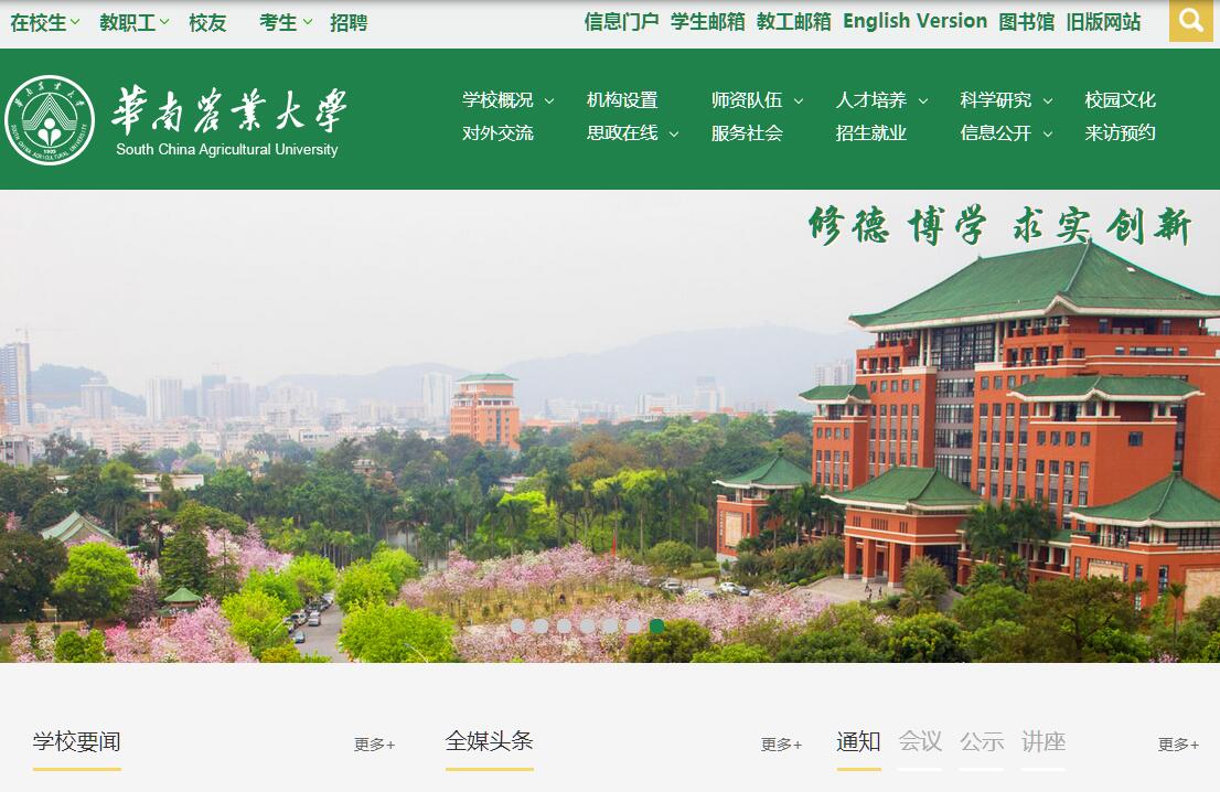 在百余年的办学历程中,学校形成了优良的办学传统、鲜明的办学特色和“修德、博学、求实、创新”的校风,建立了研究生教育、本科教育和继续教育多层次多形式的办学体系。学校学科门类齐全,有95个本科专业,12个博士学位授权一级学科,1个博士专业学位类别,28个硕士学位授权一级学科,12个硕士专业学位类别,60个博士学位授权点,119个硕士学位授权点;有农业昆虫与害虫防治、作物遗传育种、农业经济管理、果树学和预防兽医学5个国家重点学科,农业机械化工程1个国家重点(培育)学科,5个农业部重点学科,13个广东省一级重点学科,4个广东省二级重点学科和2个国家林业局重点学科。农业科学、植物学与动物学、化学3个学科进入ESI世界排名前1%。学校师资力量雄厚。现有教职工3400余人,教授、副教授1500余人,其中,中国科学院院士2人,中国工程院院士1人,引进院士团队1 个,国务院学位委员会学科评议组成员5人,国家“千人计划”11人,“长江学者奖励计划”教授9人,国家杰出青年基金获得者7人,国家优秀青年基金获得者3人,国家特支计划(万人计划)12人,广东省领军人才2人,广东省特支计划27人,广东省高等学校珠江学者岗位计划25人,人(事)社部“百千万人才工程”人选8人,教育部跨/新世纪优秀人才培养计划12人,广东省 “千百十工程”国家级培养对象5人,科技部中青年科技创新领军人才6人,农业部农业科研杰出人才4人,国家级教学名师3人,国家级教学团队4个,博士生导师311人,硕士生导师1145人。学校致力于创新人才培养模式,着力培养信念执著、品德优良、知识丰富、本领过硬的高素质专门人才和拔尖创新人才。学校设有26个学院(部),现有全日制在校生4.2万余人,其中本科生3.6万余人,研究生5000余人,来自40个国家和地区的留学生131人。有国家级精品(双语)课程13门、省级精品课程26门、国家精品视频公开课2门、省级精品视频公开课程6门。国家级精品资源共享课6门、省级精品资源共享课57门。国家级实验教学示范中心4个、广东省高校实验教学示范中心25个,国家级特色专业12个、广东省特色专业25个,国家专业综合改革试点2个,国家卓越人才培养计划专业8个。国家人才培养模式创新实验区1个,国家大学生校外实践教育基地6个。学校形成了以丁颖创新班为突破点,以主辅修、双学位、国际联合办学为主线,以平台加模块为基础的点、线、面相结合,分层次、多样化的人才培养新模式;实施研究生教育创新计划成效显著,目前学校共获全国优秀博士学位论文4篇,提名论文6篇,论文学科涵盖了农学、工学和管理学等门类。2014年被教育部评为“全国毕业生就业典型经验高校”。学校拥有开展科学研究的良好条件。现有亚热带农业生物资源保护与利用国家重点实验室、国家植物航天育种工程技术研究中心、国家生猪种业工程技术研究中心、人兽共患病防控制剂国家地方联合工程实验室、畜禽育种国家地方联合工程研究中心(广东)、国家兽医微生物耐药性风险评估实验室、畜禽产品精准加工与安全控制技术国家地方联合工程研究中心(广东)、国家精准农业航空施药技术国际联合研究中心等8个国家级科研平台,博士后科研流动站11个,教育部重点实验室2个,农业部重点实验室10个,农业部科学观测实验站3个,国土资源部重点实验室1个,广东省重点实验室13个,广东省工程实验室1个,教育部工程研究中心3个,广东省工程技术研究中心33个,广东省普通高校产学研结合示范基地8个,广东省人文社科重点研究基地2个。农业部植物新品种测试分中心(广州)、农业农村部畜禽产品质量监督检验测试中心(广州)、农业农村部植物及植物用微生物生态环境安全监督检验测试中心(广州)、广东农村政策研究中心、广东省低碳经济和应对气候变化研究中心、广东省质量监督木材及木制品检验站均设在学校。学校教学服务条件优越。图书馆藏书890.01万余册(含电子文献);校园网可与互联网千兆高速互联;现代教育技术中心拥有先进的视听制作、多媒体课件制作设备,可为师生提供现代教育技术教学条件的各种手段;有直接为大学生服务的校内外语教学广播电台、毕业生就业指导中心、勤工助学管理服务中心、心理健康辅导中心和学生活动中心;有14个校内教学实习基地和550个校外教学实习基地;建有4个标准塑胶跑道运动场和各类运动场地。学校积极开展对外交流与合作。先后与五大洲的30个国家和地区的91所大学及研究机构签订了校际合作协议或备忘录,并开展形式多样的本科生、研究生联合培养和假期交流项目;与港澳台地区一些大学的学术交流也日益加强。每年都有大批国(境)外学者来校交流和讲学。学校先后派出大批骨干教师到国(境)外进修攻读学位或进行科研合作。联合国开发计划署(UNDP)、粮农组织(FAO)和世界粮食理事会(WFC)先后在我校建立了亚太地区蚕桑培训中心和中国国际农业培训中心。在新的历史发展阶段,华南农业大学将坚持崇尚学术、质量第一的办学理念,坚持育人为本、德育为先的教育理念,坚持学术立校、人才强校、特色扬校、学风塑校、和谐兴校的办学方略,坚持规模、结构、质量、效益协调发展的办学方针,坚持农林学科创新发展、理工学科择优发展、人文社科特色发展的发展思路,努力把学校建设成为以农业科学和生命科学为优势,以热带亚热带区