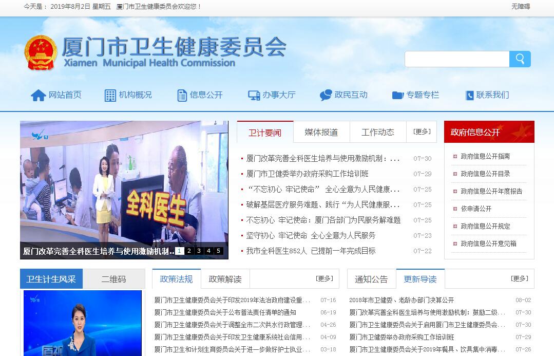 厦门市卫生健康委员会主要职责:(一)贯彻执行国家、省有关卫生、计划生育和中医药的法律法规和方针政策;负责起草我市卫生和计划生育、中医药事业发展的地方性法规、政府规章和政策规划,并负责组织实施;拟订并组织实施全市卫生和计划生育事业发展中长期发展规划和目标;统筹规划与协调全市卫生和计划生育服务资源配置。(二)负责拟订并组织落实疾病预防控制规划、免疫规划、危害人民健康的公共卫生问题的干预措施;拟订卫生应急和紧急医疗救援预案、突发公共卫生事件监测和风险评估计划,组织和指导突发公共卫生事件预防控制与应急处置;按规定公布法定报告传染病疫情信息、突发公共卫生事件应急处置信息。(三)负责拟订和指导落实职责范围内的职业卫生、放射卫生、环境卫生、学校卫生、公共场所卫生监管政策措施和饮用水卫生监督政策措施,组织开展相关监测、调查、评估;负责传染病防治监督工作;组织开展食品安全风险监测、评估,负责食品安全企业标准备案。(四)负责拟订并组织实施基层卫生、妇幼卫生和计划生育服务发展规划、政策措施和服务标准;负责妇幼保健的综合管理和监督,依法管理计划生育技术服务工作;组织指导基层卫生、妇幼卫生和计划生育服务体系建设,推进基本公共卫生和计划生育服务均等化;完善基层卫生运行新机制和乡村医生管理制度,完善合理分级诊疗模式。(五)负责全市医疗机构和医疗服务全行业监督管理;组织实施医疗机构及其医疗服务、医疗技术、医疗质量、医疗安全的管理,依法监督管理采供血及医疗机构临床用血质量;加强医疗质量监控,建立医疗机构、计生服务机构的服务质量评价和监督管理体系;组织实施卫生和计划生育专业技术人员准入、资格标准、执业规则和服务规范;依法规范医疗服务市场;指导平安医院建设;指导医疗事故争议处理。(六)拟订本部门深化医疗卫生体制改革具体方案;负责指导基层医疗卫生和计划生育机构综合改革;负责推进公立医院改革,建立科学的医疗绩效评价机制和适应行业特点的人才培养等制度;鼓励和引导社会资本举办医疗机构;提出医疗服务和药品价格政策的建议;探索建立健全公立医院法人治理结构和现代医院管理制度;按规定负责公立医院国有资产监管;组织指导所属公立医院安全防范系统建设。(七)组织实施基本药物制度,贯彻执行国家及省药物政策和基本药物制度;制定并组织我市实施国家及省药物政策和基本药物制度的相关政策措施;负责全市医疗机构的药事及麻醉药品、一类精神药品印鉴卡的监督管理工作;配合省药品集中招标采购的工作;依法建立完善计划生育药具管理制度。(八)贯彻中西医并重的方针,完善中医药事业发展政策和机制,健全中医药服务和管理体系,扶持和促进中医药事业发展,制定中医药中长期发展规划。(九)负责完善生育政策,组织实施促进出生人口性别平衡的政策措施,组织监测计划生育发展动态,提出发布计划生育安全预警预报信息建议;组织实施优生优育和提高出生人口素质的政策措施,推动实施生殖健康促进计划,降低出生缺陷发生率。(十)推动完善计划生育利益导向、计划生育特殊困难家庭扶助和促进计划生育家庭发展等机制;负责协调推动有关部门、群众团体履行计划生育工作相关职责,建立计划生育政策与经济社会发展政策的衔接机制,提出并推动落实稳定低生育水平的政策措施。(十一)拟订并组织实施卫生和计划生育人才发展规划,组织开展卫生和计划生育人才队伍建设;组织实施毕业后医学教育和继续医学教育工作,加强全科医生等急需紧缺专业人才培养,组织实施住院医师和专科医师规范化培训制度。(十二)拟订并实施卫生和计划生育科技发展规划、医学学科建设规划、继续医学教育发展规划;组织开展相关科学研究、新技术评估管理、科研成果评价,指导科技成果推广应用、医学科普工作;组织指导全市医学重点学(专)科建设、科技平台与重点实验室建设。(十三)监督检查卫生和计划生育相关法律法规、政策措施的落实,完善全市卫生和计划生育综合监督执法体系建设,指导规范执法行为,组织查处重大违法行为;负责对计划生育目标管理执行情况进行考核评估;监督落实计划生育一票否决制。(十四)负责组织、指导、协调流动人口计划生育工作,拟订并组织落实流动人口计划生育服务管理规划;协调建立全市流动人口医疗卫生、公共卫生、计划生育信息共享和公共服务工作机制。(十五)拟订并组织实施卫生和计划生育宣传教育工作规划;负责卫生和计划生育宣传、健康教育、健康促进和信息化建设、统计、信息分析等工作,依法组织实施统计调查,参与全市人口基础信息库建设。(十六)组织指导卫生和计划生育工作领域的国际交流与合作;开展与港澳台侨的交流与合作;统筹协调卫生和计划生育对口支援工作。(十七)承担市委干部保健委员会的日常工作,负责市委干部保健委员会确定的干部保健对象的医疗保健工作;负责重要保健对象及大型会议、重大活动的医疗保障工作。(十八)承担市人口和计划生育工作领导小组、市爱国卫生运动委员会、市防治艾滋病工作委员会和市地方病防治协调领导小组的日常工作。(十九)承办市委、市政府交办的其他事项。