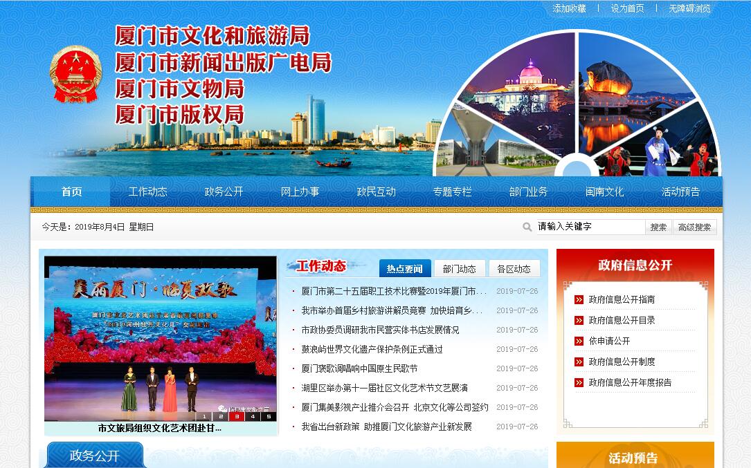 厦门市文化和旅游局主要职责是:(一)贯彻执行党和国家有关文化艺术、广播影视、新闻出版、著作权工作的方针、政策和法律法规;研究起草有关文化艺术、广播影视、新闻出版、著作权管理等方面的地方性法规和规章,经审议通过后组织实施;拟订文化艺术、广播影视、新闻出版、著作权事业中长期发展规划,经批准后组织和监督实施。(二)负责拟订全市文化艺术、广播影视、新闻出版产业规划和政策,经批准后组织实施;负责指导、协调、推动全市演艺、影视、动漫、游戏等产业发展。(三)组织、指导和管理全市艺术创作和艺术研究;扶持精品创作,推动各门类艺术发展和繁荣;依法管理全市重大文化活动;指导全市艺术教育工作;管理、指导市级专业剧团建设。(四)推进公共文化服务,管理全市群众文化艺术活动以及群众艺术馆、文化馆、公共图书馆事业;监督、指导重点文化设施建设和基层文化设施建设;协调市级公共文化设施管理;指导、推动开展各类群众性文化工作。(五)组织实施全市文化艺术、广播影视、新闻出版行业体制机制改革;负责组织、协调、指导系统直属单位的体制机制改革。(六)依法管理全市文化艺术、广播影视、报刊、网络宣传工作;监管全市广播影视节目、信息网络视听节目和公共视听载体播放的视听节目及各类出版物;负责对互联网出版活动和开办手机书刊、手机文学业务进行监管。(七)依法管理全市文化市场和出版物市场;拟订全市文化市场管理和出版物市场管理相关政策和规定并组织实施;承担市文化市场管理领导小组和市“扫黄打非”领导小组日常工作。(八)负责拟订全市文化艺术、广播影视、新闻出版科技发展规划并组织或监督实施;指导全市文化艺术、广播影视、新闻出版科技工作,贯彻执行相关技术标准;组织推进全市文化艺术、广播影视、新闻出版公共服务体系建设;组织、指导、监督全市文化艺术、广播影视、新闻出版重大工程项目的实施;指导、监管全市广播电视节目传输覆盖、运营维护、技术监测、设施保护和安全播出。(九)指导和管理全市文物、博物馆事业;指导协调全市文化遗产管理、保护、发掘、研究、鉴定、出境和宣传工作;拟订非物质文化遗产保护规划并组织实施,开展闽南文化生态保护实验区建设工作;负责申报各级文物保护单位;编制、申报、核拨、管理文物维修经费。(十)指导和管理文化艺术、广播影视、新闻出版、著作权方面的对外以及与港澳台地区的交流与合作工作;推进对外文化交流与合作。(十一)承办市委、市政府和上级部门交办的其他事项。
