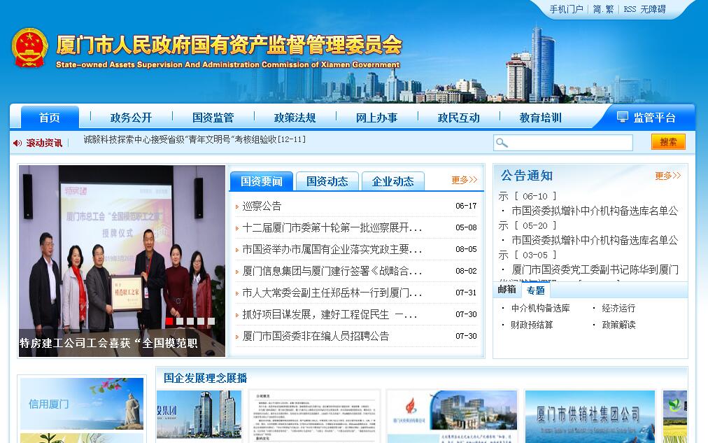 厦门市人民政府国有资产监督管理委员会主要职责: 1.贯彻执行国家和省、市有关国有资产监督管理的法律法规和方针、政策,起草我市有关国有资产监督管理的地方性法规、规章以及有关规范性文件,经批准后组织实施。拟订经营性国有资产的监管制度和办法并组织实施。2.根据市政府授权,依照法律法规履行出资人职责,依法维护国有资产出资人权益。3.承担监管市属企业国有资产的责任,加强国有资产的管理工作,进一步完善权利、义务和责任相统一,管资产与管人、管事相结合的国有资产管理体制。4.承担监督所监管企业国有资产保值增值的责任,建立和健全国有资产保值增值指标体系,制定考核标准,通过统计、审计和稽核等方式,对所监管企业国有资产的保值增值情况进行监管。5.负责所监管企业工资分配管理工作,制定并组织实施所监管企业负责人收入分配政策,规范所监管企业负责人收入分配、职务消费。6.按照出资人职责,依法参与所监管企业的重大决策。指导所监管国有企业改革发展总体规划的研究编制,推动国有经济布局和结构战略性调整。指导推进国有企业改革和重组,指导国有企业现代企业制度建设,依法建立和完善法人治理结构。7.按照市委规定,通过法定程序对所监管企业负责人进行任免、考核并根据其经营业绩进行奖惩。建立符合社会主义市场经济体制和现代企业制度要求的选人、用人机制,完善经营者激励和约束制度。8.负责向所监管企业委派或推荐董事、监事,负责企业董事会和派出监事小组的日常管理工作。按照企业负责人管理权限的规定,负责所监管企业负责人的经济责任审计工作。9.负责组织和监督所监管企业上交国有资本收益,依法承担所监管企业年度国有资本经营预算编制和执行有关工作。10.依法对区级国有资产监管相关工作进行指导和监督。11.负责督促检查所监管企业贯彻落实国家安全生产方针及有关法律法规、标准等工作。12.承办市政府交办的其他事项。