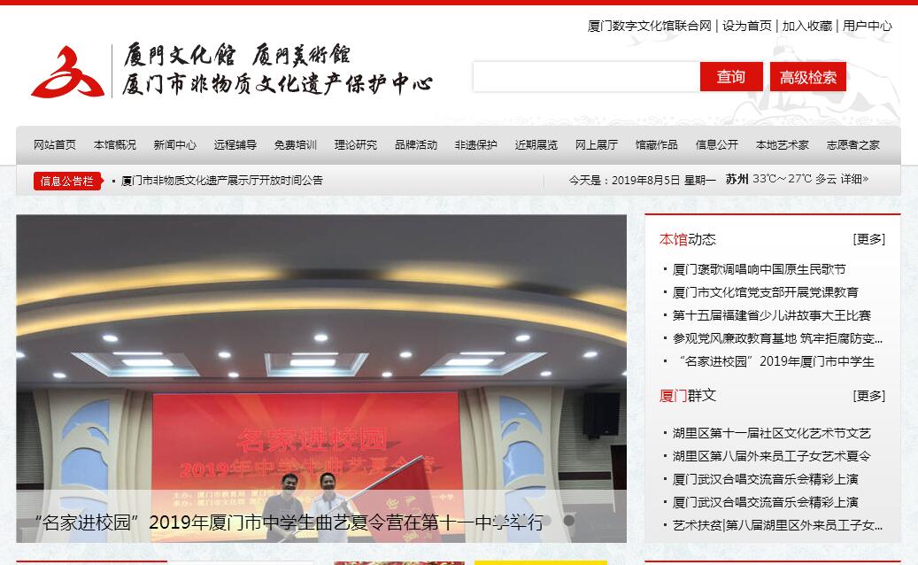 厦门市文化馆为国家一级文化馆,与厦门市美术馆、厦门非物质文化遗产保护中心合署办公。是人民政府设立的公益性文化事业机构,承担繁荣群众文化、组织群众文艺创作、开展宣传教育、艺术培训、群众文化理论研究、美术展览与收藏、民族民间文化保护与传承以及公共数字文化等惠民服务职能。厦门市文化馆现位于厦门市体育路95号文化艺术中心内,总面积28000平方米,设有音乐、舞蹈、戏剧、曲艺、美术、书法等排练厅、教室、琴房及电子阅览室、非遗展示厅等,并设有大型现代艺术展厅、平面艺术展厅、精品展厅和多媒体展厅等展览厅,其中大型现代艺术展厅面积近4000平方米,层高近10米。作为厦门公共文化的重要组成部分和窗口单位,厦门市文化馆在市委市政府、市文广新局的领导下,以“坚持公益、文化惠民”为服务理念,充分发挥职能作用,全方位、多形式为群众提供公共文化服务。平均每年组织开展各类群众文化活动近百场次,年举办馆内阵地培训150个班,培训群众近80000人次。常年开展下区、镇(街)、村(居)辅导活动,组织成立青年民族乐团、中老年艺术团等文艺团队13个、文化活动基地和未成年人文化活动基地(示范点)28个。形成和培育了“厦门市群众文化艺术节”、“厦门青年民族乐团”、“新圩三子文化”等群众文化活动品牌。“厦门市群众文化艺术节”被授予全国群文活动品牌,辅导创作的儿童木偶戏《小圣斗巨蟒》获第十届中国艺术节群星奖。组织各类展览、收藏、推广美术公众教育活动,年平均举办各类展览80场,承办了全国漆画展、十一届全国美展、全国农民画展等大型展览。现有各级非遗项目64项、有非遗传承人121人。组织了海峡两岸闽南语歌曲歌手赛、南音唱腔比赛、莲花褒歌赛等品牌赛事。全面落实闽南文化生态保护区工作,组织闽南文化进校园等推广普及闽南文化活动。同时,厦门市文化馆积极打造全方位的数字文化馆,创新数字化文化服务机制,借助现代化技术手段拓展公共文化服务形式。开放“厦门市文化馆”官方网站,建立“远程辅导”、“免费培训网上报名”、“网上展厅”等多个专栏,开发和建设手机、平板等多个客户端,充分利用微博、微信等新媒体,开通官方微博“厦门文化馆_厦门美术馆”和微信公众平台、微网页等数字平台,提供全天候的服务,在推进厦门公共文化服务体系建设和美丽厦门建设、实现公共文化服务标准化、均等化方面,发挥了积极的作用。
