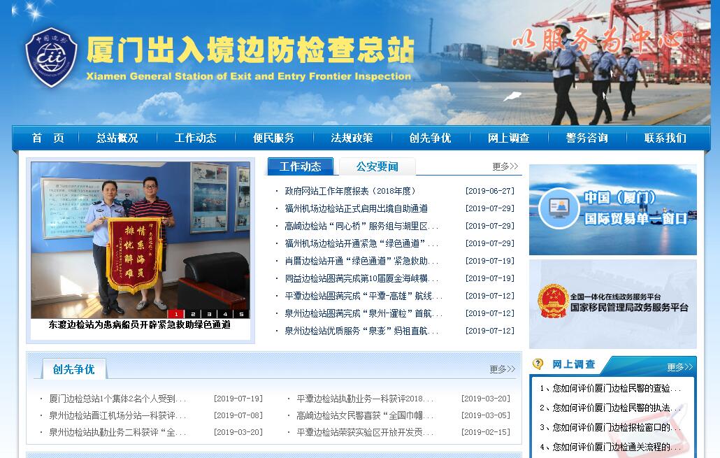 边检机关是国家设立在对外开放口岸的公安行政执法机构,依法对出境入境的人员及其携带的物品、交通运输工具及其载运的货物实施边防检查;按照国家有关规定对出境入境的交通运输工具进行监护和管理;对口岸的限定区域进行警戒,维护出境入境秩序,并履行法律、行政法规规定的其他职责。中华人民共和国厦门出入境边防检查总站由公安部垂直领导,正厅级建制,主要负责厦门口岸出入境交通运输工具和人员的边防检查任务。总站机关内设办公室、政治处、督察处、纪委办、边检处、后勤处、技术处等7个部门,下设培训中心、遣返审查所、服务中心等3个直属单位。总站现下辖东渡、高崎、海沧、同益4个出入境边防检查站。其中,东渡出入境边防检查站主要担负同益、东渡、海天、象屿、国贸、石湖山、现代等对外开放货运码头出入境边防检查任务;高崎出入境边防检查站主要担负高崎国际机场出入境边防检查任务;海沧出入境边防检查站主要担负嵩屿、国际货柜、海润、远海、新海达、博坦仓储、翔鹭石化、海鸿石化、海澳石化、利恒化工、华夏电力、海宇、厦船重工、海隆码头等对外开放货运码头出入境边防检查任务;同益出入境边防检查站主要担负厦门国际邮轮中心、五通客运码头等对外开放客运码头出入境边防检查任务。