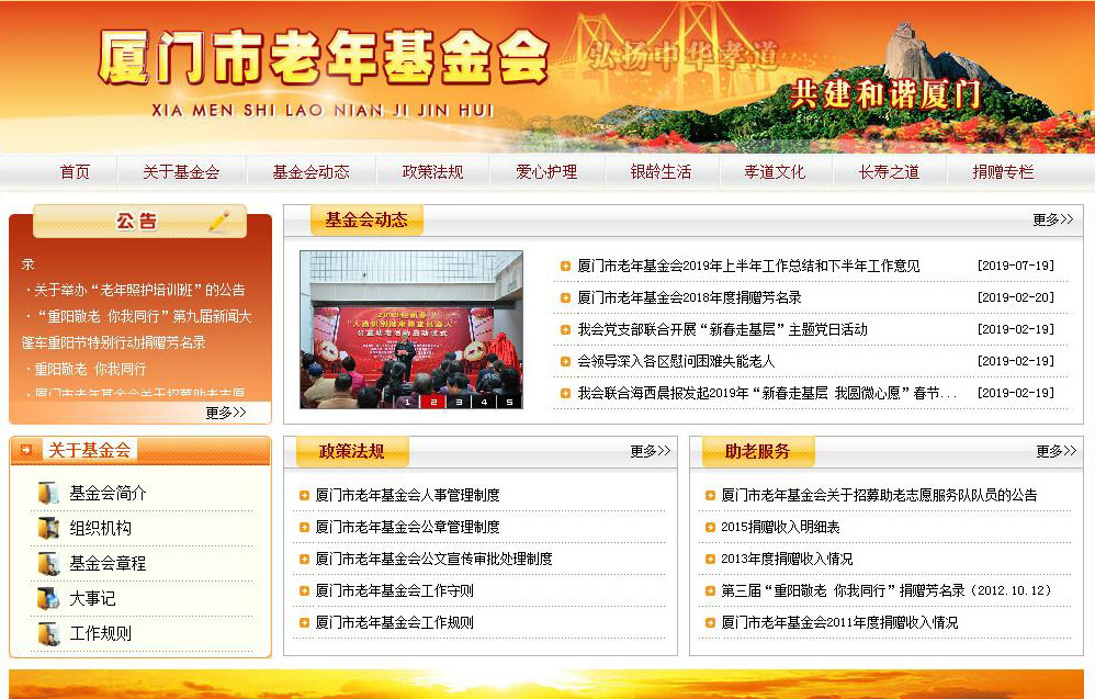 厦门市老年基金会成立于1992年8月,是福建省第一家注册登记,为老年人服务的公募基金会。创会会长是厦门市政协原主席林源。基金会的宗旨是,弘扬中华民族敬老、爱老、助老的传统美德,动员社会各界和海内外人士募集资金,资助举办老年福利事业。协助党委政府促进我市老龄事业的发展。主要业务范围;(一)宣传人口老龄化的形势,动员社会各界关心老年人、帮助老年人;(二)组织开展各种形式的募捐活动,接受国内外企事业单位、团体、个人及其他组织的捐赠,不断壮大基金规模,发展老龄公益事业;(三)管理和使用基金,开展基金保值增值业务;(四)投资、创办和资助各种老年社会福利、文化、教育、体育、卫生事业等项目;(五)奖励为发展老龄事业做出杰出贡献的团体和个人、老年杰出人物和优秀人才;(六)资助城乡特困老年人;(七)组织和资助开展有益于提高老人生活、生命质量的各种活动;(八)开展与港、澳、台同胞,国内外友好团体和人士及相关国际组织的合作和交流活动。基金会自成立以来,在福建省民政厅和主管部门省老龄办的指导下,在一批老领导老同志的关怀和社会各界的大力支持下,在历届理事会的领导下,遵循基金会的宗旨,通过政府财政资助,社会各界捐赠、基金增值等方式,筹集了一定数量的资金,并利用筹集的资金为老年人办实事、办好事。2006年荣获“八闽慈善奖”;2009年荣获福建省第一批“5A基金会”称号。创立“助老工程”品牌。从启动至2010年底,共助养特困老人3733人次;帮助患白内障的664位特困老人恢复光明;对身患重病、因病致困、急需救助的老年人及时开展救助,截止2011年6月10日,共救急困难老人133人次,发放救急配套费30多万元。开设“温馨夕阳老人谈心热线”和咨询中心,招募老医学专家、律师志愿者,为老年人提供法律、医疗、精神和生活等方面的服务。此外,每年春节老年节组织送温暖活动,慰问困难老人和高龄老人达12000多人次。该活动自开展以来累计支出资金900多万元。“助老工程”项目被群众誉名为“银色希望工程”。大力弘扬敬老传统美德。2010年老年节,基金会与《厦门日报》、市委文明办等共同发起了新闻大篷车重阳节特别行动-“重阳敬老,你我同行”宣传活动,广泛宣传爱心企业和人士敬老助老的感人事迹,积极营造全社会都来关心老龄慈善事业的社会氛围。短短10天就有45家单位和个人为老人慈善捐款116万多元。资助市老龄办举办的二年一届的“十佳敬老家庭”评选活动,倡导全社会尊重家中长辈,关心帮助其他老人,并以“十佳敬老家庭”的行动带动更多的家庭一起尊老、敬老、爱老、助老,促进社会和谐;举办孝道文化专题讲座,并出版《新辑二十四孝义》。我会编印《新辑二十四孝义》一书,向全市机关、学校、企事业单位、城乡各基层组织和爱心人士赠送8000余册。创建市爱心护理院。随着我国老龄化社会的形成,老年人特别是高龄有病的老年人缺乏专业护理,老人护理成为一个广为关注、亟待解决的社会问题。2005年,经市政府批准,基金会向社会募捐,在仙岳山南麓兴建厦门市爱心护理院,市爱心护理院占地面积3400平方米,建筑面积1.18万平方米,总投资3800多万元,设计300张床位,具备医疗护理、生活照料、康复保健、心理护理、休闲娱乐、膳食服务和临终关怀等功能。本着“帮天下儿女尽孝,给世上父母解难,为党和政府分忧”的宗旨,市爱心护理院主要接纳需要提供半护理、全护理服务的老年人。市爱心护理院的建成,成为了全市中具有示范作用的养老服务机构,并先后被中国老龄事业发展基金会、福建省老龄事业发展基金会确定为全国、省“爱心护理工程”试点单位。2009年10月,中国老龄事业发展基金会批复厦门市爱心护理院为“全国爱心护理工程建设基地”,为推动我市老年护理事业的发展做出了贡献,资助老年文化体育活动。为满足和丰富老年人的精神文化生活,提高老年人生活幸福指数,基金会在省、市老龄办的指导下,积极参与和资助涉老组织开展各项文化、体育活动。基金会成立以来,共拨出407.09万元资助市老年体育协会、市老年学学会、市老年大学、市老朋友艺术团、市老年艺术协会、市老年交谊舞协会、市老年战士合唱团、市老干部集邮协会、市老年书画研究会等老年组织开展丰富多彩的文化、体育、作品展示、“健康大讲堂”和学术研讨等活动。与此同时,拨出226.22万元资助基层老年活动场所的建设,为部分有困难的基层老年活动场所配置文体活动器材,改善活动条件。厦门市老年基金会是个很有作为的组织。面对老龄化社会,基金会将在厦门市委、市政府和主管部门的领导下,坚持基金会的宗旨,进一步解放思想,转变观念,创新工作方法,不断提高管理和服务水平,为老龄事业发展做出更大的贡献。基金会向多年来热心赞助和关心我市老年福利事业的单位和个人致以崇高敬意和表示衷心感谢!