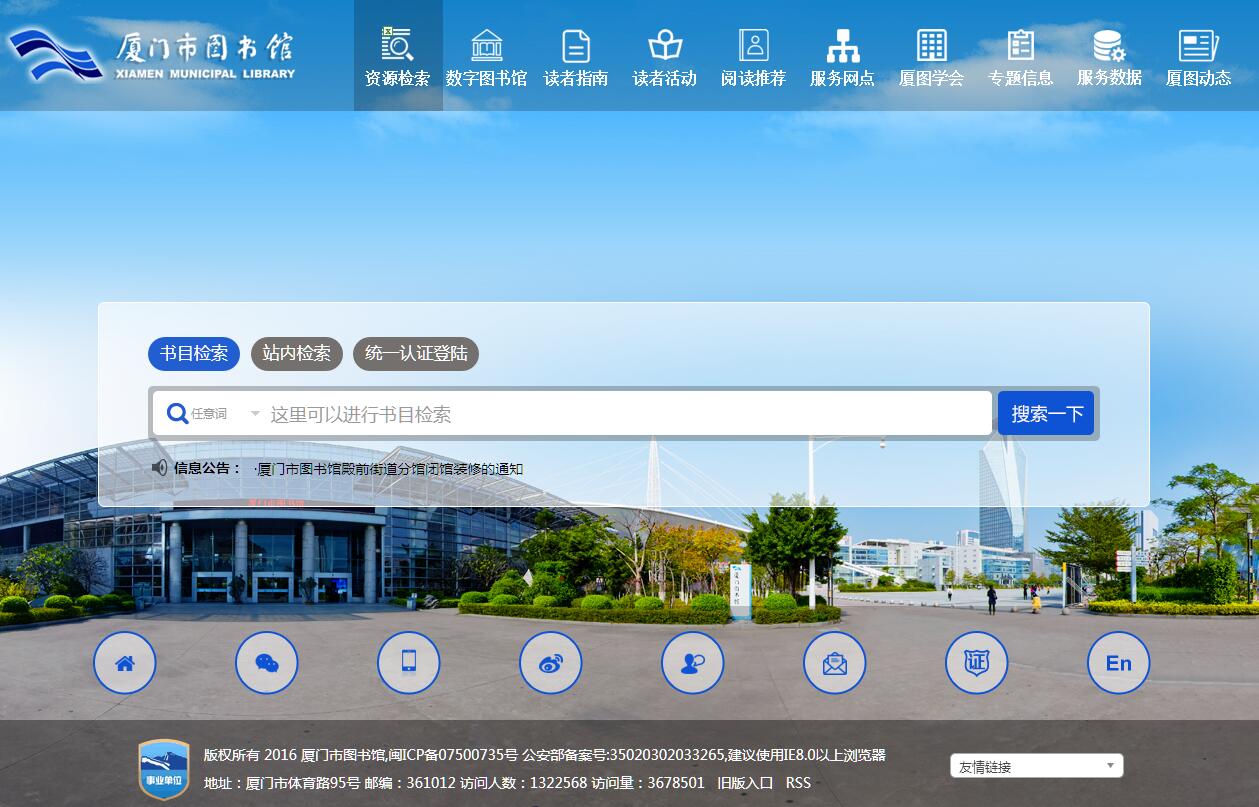 厦门市图书馆创办于1919年,有着九十多年的历史。原馆舍位于公园南路2号,由旅居香港的老读者杨贻瑶先生捐资兴建。2007年3月1日迁入厦门文化艺术中心新馆。新馆建筑面积25732平方米(不含共享使用面积),拥有上、下两层各六千平方米的“藏、借、阅、检、咨一体化”的开放式阅览空间。现有文献415.47万册,以闽南地方文献为收藏特色。厦门市图书馆以“全方位开放、全公益服务、全社会共享”为服务方针,以社会化办馆为理念,以人性化的平等、免费、便捷服务为原则,形成在建筑设施、馆藏资源、读者工作等要素上实行全方位开放的办馆模式,为读者提供多层次、多元化、多形式的服务,最大限度地满足读者各种层次的信息需求。全年365天开放,并实行免费服务,日均接待读者1.2万人次。馆内可无线上网,并配置了触摸屏导读系统和阅报系统、自助借还书机、自助复印机、自助扫描仪,还提供图书外借预约、电话续借、网上续借以及短信催还等多种开放性服务措施,同时设立自助图书馆,使读者获取文献信息更为便捷、自由;全年开展公益性的读书沙龙、专题讲座、周末电影、故事会、展览等多种形式的读者活动,丰富读者阅读内容,提升服务内涵;常年深入社区、学校、企业开展图书馆服务宣讲活动,引导广大市民利用图书馆,发挥图书馆的社会教育职能。2011年以来年均举办公益性培训、展览、讲座,开展读书活动等各类主题活动1110场。成为目前国内开放程度较高、较具服务特色的综合性公共图书馆。厦门市图书馆常年坚持服务基层,以实现本地区公共文献信息资源共享为目标,致力于构建一个以现代化网络通信技术为依托,以厦门市图书馆总馆为中心,各区图书馆为骨干,镇(街)、村(居)图书室为节点的公共图书馆联合服务网络。目前市区两级图书馆已实现借书证通用,图书通借通还,文献联合编目、数字资源共建共享,读者活动互联互动。2010年,还与国家数字图书馆签订战略合作协议,实现“国家数字图书馆厦门全覆盖”,有效地提升了厦门地区数字资源的服务能力。近年来,厦门市图书馆还在鼓浪屿、海沧、杏林、灌口等建有17个直管型、托管型、联办型分馆和5个流通点,初步形成覆盖全市的公共图书馆服务网络。“全方位开放、全公益服务、全社会共享”的服务方针和社会化办馆的服务理念为厦门市图书馆赢得了良好的社会效益。2016年,厦门市图书馆接待读者439万人次,外借文献393万册次,各项业务指标居全国公共图书馆前列,获得了全国文化系统先进集体、全国三八红旗集体、全国巾帼文明岗、文化部一级图书馆、福建省文明单位等荣誉称号,并被命名为全国科普教育基地、福建省社科普及基地。成为融入社会、贴近民众的市民终身教育的知识殿堂和独具特色的海峡西岸中心城市公共文献信息资源共享的保障中心。