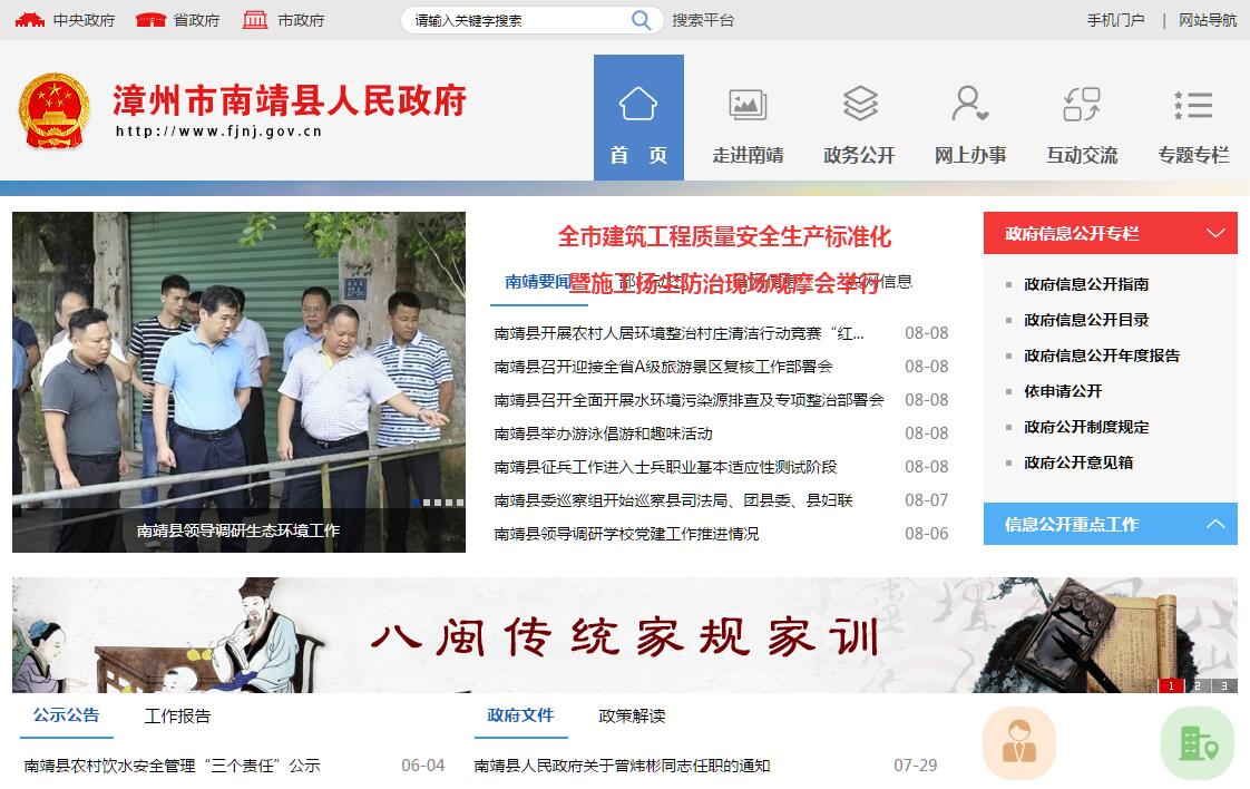 南靖,古称兰水县,置县于元至治二年(1322年)。地处漳州市西北部,面积1962平方公里,人口36万,辖11个镇、1个国家级高新技术产业园区,共有200个村(居),其中行政村183个、社区居委会17个。概括起来主要有以下几个特点:1.区位优越,交通便捷。与漳州市区相连,距漳州港60多公里,厦门港、厦门国际机场70多公里,龙厦高铁、厦蓉高速、福广高速、靖海高速和国道319线穿境而过,属厦门湾1小时经济圈和厦漳泉大都市区范围。2.自然生态优美。是全省首批国家生态县,国家生态文明建设示范区,拥有虎伯寮国家级自然保护区和福建土楼南靖国家森林公园,素有“树海”、“竹洋”之称,森林覆盖率73.16%,林地绿化率98.3%,均居漳州市首位。3.旅游资源独特。是中国旅游竞争力百强县,除世界文化遗产、国家5A级旅游景区—福建土楼(南靖)景区外,还拥有全省唯一的首批中国历史文化名村—田螺坑村,全国唯一的家庙类国家级重点文物保护单位—塔下张氏家庙“德远堂”,供奉着海峡两岸仅存的两尊宋元时期保生大帝金身之一的闽南宗教文化研究瑰宝—慈济行宫,被誉为“华东黄果树”的树海瀑布等丰富的自然和文化旅游资源。4.农业优势突出。是兰花、金线莲、香蕉、麻竹、芦柑五个“中国之乡”,是中国白背毛木耳生产示范基地、全省最大的兰花集散地和咖啡、铁皮石斛种植基地,是全国休闲农业与乡村旅游示范县、闽台农业合作示范县和高优农业示范区。5.民营经济活跃。拥有中国品牌500强、全国首批创新型企业万利达集团和闽星、港兴、利南等十大民营企业集团,民营企业产值、税收占全县比重均达85%以上。6.侨台优势明显。是漳州市重点侨乡和台胞重要祖籍地之一,有海外华人华侨3万多人,祖籍南靖台胞100多万人,萧万长、吕秀莲等台湾知名人士祖籍地均在南靖。7.革命历史悠久。是原中央苏区县、省重点老区县,是中央红军东路军漳州战役的主战场,毛泽东、聂荣臻、罗荣桓等上百位革命先辈和开国将军曾在南靖战斗、生活过。