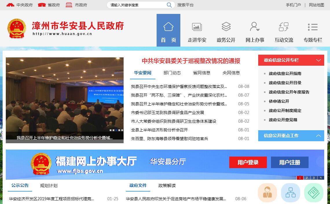 华安1928年置县,全县辖6镇3乡、1个省级经济开发区(华安经济开发区)和4个国有林场(金山、西陂、葛山、利水),土地总面积1315平方公里,人口16万;境内有畲族、高山族等少数民族,是祖国大陆高山族同胞聚居最多的县份。华安属于“原中央苏区县”,是世界文化遗产地、国家森林公园、全国生态建设示范县、全国重点产茶县、全国茶叶特色县、中国名茶之乡、全国科技进步先进县、全国科技工作先进县、中国坪山柚之乡、中国观赏石之乡、中国民间玉雕艺术之乡、中国绿色食品之乡和全国绿色食品原料(铁观音茶叶)标准化生产基地县。华安资源独具特色,主要有:一是森林资源。全县有山地面积176万亩,有林地138万亩,天然林面积44万亩,木材蓄积量380万立方米,森林覆盖率达73%,位居全市前列,是全省重点林业县。二是水电资源。全省第二大江—九龙江北溪贯穿全境,华安境内长107公里,流域面积1137平方公里。全县水能资源理论蕴藏量46万千瓦,可开发装机容量42万千瓦。目前,全县已建成水电站236座,装机37.55万千瓦,年发电量16亿千瓦时,创产值4.16亿元,居漳州市首位。三是矿产资源。主要有华安玉(九龙璧)、石英石、温泉等20多个种类。其中,华安玉展播面积104平方公里,储量达1亿立方米以上,是“十大国石候选石”,被确定为“八闽名石”、“漳州市石”,已开发出工艺品、观赏石、保健品、建筑板材等四大系列产品。四是旅游资源。县域生态良好,全境被命名为国家森林公园。人文景观独特,有二宜楼、南阳楼、东阳楼、仙字潭、南山宫5处“国保”单位,东溪窑和齐云楼2处“省保”单位。其中,以二宜楼为代表的华安大地土楼群于2008年7月被正式列入“世界文化遗产名录”。目前,我县正加快做好“东溪窑”遗址海上丝绸之路漳州(华安)史迹申报世界文化遗产的前期工作,如果申报成功,华安将成为全国少有的拥有两处世界文化遗产的县份。