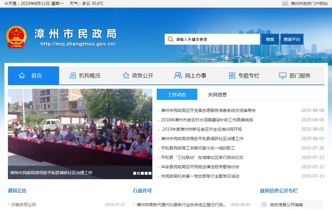 漳州市民政局主要职责:(一)贯彻执行国家、省有关民政工作的法律法规和政策,拟订并组织实施我市有关民政工作的规范性文件,拟订并组织实施全市民政事业发展规划。(二)承担对社会团体、民办非企业单位进行登记管理和监察的责任,指导全市民间组织登记管理工作。(三)负责组织指导军队退役士兵、转业士官、复员干部、离退休干部和无军籍退休退职职工的接收安置工作,拟订和协调落实有关优抚、安置政策,负责烈士褒扬工作。(四)负责组织协调救灾工作,负责组织核查、上报灾情,管理、分配中央和省、市级救灾款物并监督使用,组织指导救灾捐赠和有关防灾减灾工作,牵头组织实施政策性农村住房保险和自然灾害公众责任险。(五)牵头拟订社会救助规划和政策,健全城乡社会救助体系,负责城乡居民最低生活保障、医疗救助、临时救助、农村五保供养和城市生活无着人员救助工作。(六)拟订城乡基层群众自治建设和社区建设政策并组织实施,指导社区服务体系建设,提出加强和改进基层民主政治建设的建议,推动基层民主政治建设。(七)负责全市各级行政区域的设立、撤销、更名及政府驻地迁移的审核报批工作,组织指导全市各级行政区域界线的勘定和管理,指导地名管理工作。(八)拟订社会福利事业发展规划和政策并组织实施,负责社会福利事业机构的管理,按规定负责全市福利彩票销售和公益金管理工作,组织指导社会捐助工作,会同有关部门研究落实促进慈善事业发展的政策措施,指导老年人、孤儿和残疾人等特殊群体的权益保障工作。(九)指导全市婚姻登记管理、儿童收养登记管理工作,推进婚俗改革。(十)负责全市殡葬管理,推行殡葬改革,指导殡葬服务机构管理工作。(十一)指导全市革命老区建设工作,协调扶持革命老区经济社会发展,协调办理涉及老区的事务,负责革命“五老”人员优待管理工作,联系和指导市老区建设促进会工作。(十二)会同有关部门拟订社会工作人才队伍建设规划和相关政策,指导社会工作人才队伍和相关志愿者队伍建设。(十三)承办市委、市政府交办的其他事项。