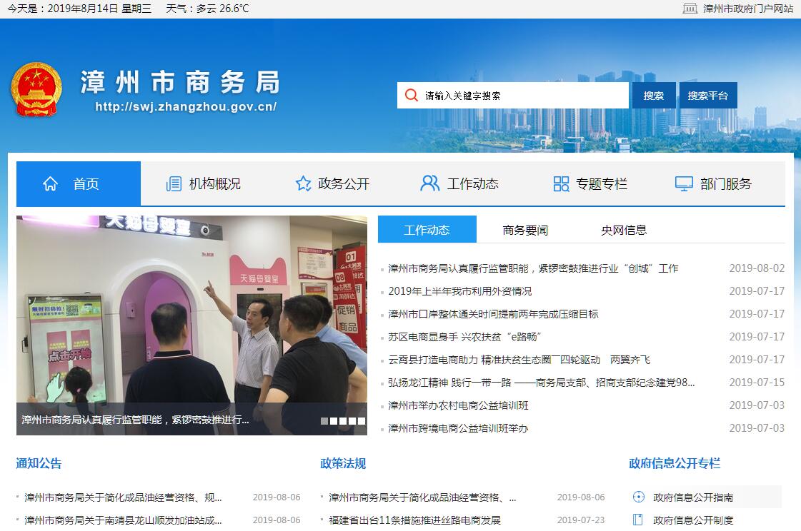 2014年9月,根据中共福建省委办公厅 省人民政府办公厅关于印发《漳州市人民政府职能转变和机构改革方案》(闽委办 〔2014〕43号)的通知,将市经济贸易委员会内贸管理的职责、市对外贸易经济合作局的职责整合,组建市商务局,为市政府工作部门,加挂市人民政府口岸工作办公室牌子。其主要职责:(一)贯彻执行国家有关投资贸易、国际经济合作、口岸管理的法律、法规和政策;指导、协调、综合管理全市商务、口岸工作;研究提出商务、口岸政策法规与国际经贸条约、规则之间的衔接意见;拟订全市商务、口岸发展战略和实施规划,监测分析商务、口岸运行状况;研究商务、口岸体制和商务运行中的重大问题并提出建议。(二)负责流通行业管理促进工作;拟订流通业发展规划,推进流通体制改革、流通产业结构调整、商贸物流中心和体系的建设,发展连锁经营、商业特许经营、物流配送、电子商务等现代流通方式,促进流通标准化;负责拍卖、旧货流通、再生资源流通、汽车(新车、二手车)流通、原油成品油流通以及酒类流通等特殊流通领域的行业管理;指导工业品流通服务体系建设、流通行业科技进步等工作。(三)负责市场体系建设和城乡市场发展促进工作;拟订引导资金投向市场体系建设的政策措施,组织实施财政性资金安排的市场体系建设重大投资项目,指导城市商业网点规划、大宗商品批发市场和社区商业建设;推进农村市场体系建设和改造升级。(四)负责商品市场运行调控和商务领域消费促进工作;拟订商品市场运行调节的政策措施,监测分析市场运行、商品供求状况,组织实施重要消费品市场调控和重要生产资料流通管理,建立健全生活必需品市场供应应急管理机制;负责城市副食品基地建设。(五)负责组织开展商务领域综合行政执法;牵头协调打击侵权和假冒伪劣商品,协调打破市场垄断、行业垄断和地区封锁的相关工作,协调管理商品贸易秩序,承担与贸易有关的知识产权工作,指导国际品牌保护、商业信用销售,对直销进行监督管理;推动商贸行业文明建设和商务领域信用建设。(六)拟订并组织实施我市电子商务发展规划和促进政策,建立适应电子商务快速发展的管理体制;完善跨部门电子商务工作协作机制,建立电子商务公共服务体系和信用体系,拓展电子商务应用;推动电子商务示范体系建设,指导全市商务领域电子政务建设。(七)贯彻执行进出口商品、加工贸易管理办法和进出口商品、技术目录,拟订我市促进外贸发展方式转变的政策措施;会同有关部门协调大宗商品进出口,指导国际品牌体系建设和出口商品基地建设。(八)贯彻执行对外技术贸易、进出口管制以及鼓励技术和成套设备出口的政策,推进进出口贸易标准化工作,依法监督技术引进、设备进口、国家限制出口技术工作;牵头拟订服务贸易发展规划并开展相关工作,会同有关部门拟订服务出口和服务外包发展规划、政策并组织实施,推动服务外包平台建设和服务外包人才培养;负责商贸服务业(含餐饮业、住宿业及有关生活服务业)和会展业管理促进工作。(九)负责组织协调反倾销、反补贴、保障措施及其他与进出口公平贸易相关的工作,建立进出口公平贸易预警机制;指导国外技术性贸易壁垒和应对工作,协助开展对外贸易调查和产业损害调查,指导协调产业安全应对工作,承担企业境外投资贸易活动的权益保护工作。(十)指导、管理全市外商投资工作,参与起草利用外资的中长期发展规划;依法审核、审批外商投资企业设立、变更及相关事项;依法监督外商投资企业执行有关法律、法规等情况并协调解决有关问题;负责外商投资有关统计工作;负责协调全市“三维”(外企、民企、央企)招商,牵头开展投资促进工作。(十一)负责全市对外经济合作工作;依法管理和监督境外投资、对外承包工程、对外劳务合作等活动,管理监督对外劳务派出机构;承担境外劳务人员的权益保护工作,牵头处置境外劳务纠纷和突发事件;负责多双边援助和对外援助工作。(十二)贯彻执行国家对台湾地区和香港、澳门特别行政区的经贸规划、政策,深化我市与台港澳地区的经贸联系,协调推进我市同台港澳地区的投资贸易与产业合作,参与处置多双边经贸领域的涉台问题。(十三)拟订全市开发区发展规划和促进政策;负责全市开发区的指导、协调和管理工作;承担开发区审核转报工作。(十四)起草并组织实施我市口岸工作的政策、规划;负责协调口岸查验机构,推动建立完善大通关工作机制;推进电子口岸建设。(十五)承办市委、市政府交办的其他事项。