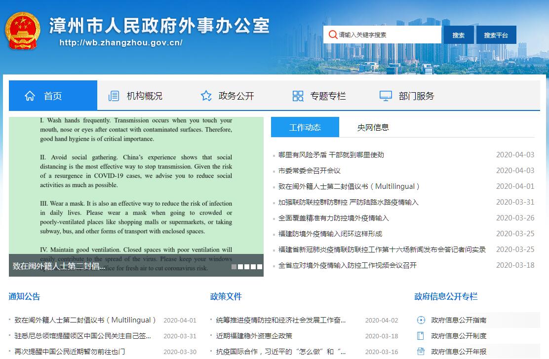漳州市人民政府外事办公室主要职责:(一)贯彻执行外事侨务工作的方针政策和市委、市政府有关外事侨务工作的指示和决定;进行外事侨务工作调研,为市委、市政府的外事侨务工作决策提供意见和建议。(二)制定本市外事侨务工作计划和规章制度;检查有关部门和单位贯彻执行外事侨务方针政策和有关法规的情况;审核报请市委、市政府审批的涉外涉侨文件;协调我市重大涉外涉侨事项;负责处理或协调处理我市重大涉外涉侨事务。(三)承办接待来访的国宾、党宾和其他重要来宾;接待来我市进行公务活动的外国驻华外交人员;归口管理经批准来访的外国记者,指导有关部门做好外国记者采访活动的安排;统筹安排市领导的外事活动;统一指导和协调各部门、各单位的外事接待工作;承办需请市领导接待会见重要华侨华人、港澳同胞知名人士及其重要社团的审核报批工作。(四)承办市领导和我市其他人员因公出国、赴港澳有关事项;承办邀请外国相当于我国现职副省级以上及非经贸类人员来访的报批事宜;审批应邀商务来访的外国副省级以下人士入境事宜。(五)认真贯彻执行涉外人员守则,配合纪检、监察等部门检查外事纪律的执行情况,及时向有关部门提供违反外事纪律问题的处理意见和建议,协助或会同有关部门查处违反外事纪律的行为。(六)统筹安排本市各部门、各单位与外国领事机构的交往活动;承办外国驻华使领馆领事认证事宜。(七)指导和促进我市与外国友好城市及其他结好单位的交往活动,办理对外结好的报批手续;指导民间对外交往工作。(八)会同有关部门管理口岸的外事业务和涉外事宜。(九)指导有关部门管理外国专家工作;处理或协助处理涉及外国人管理工作的重要事项。(十)承担市委外事工作领导小组办公室的日常工作;配合外交部做好我市赴外交流和研修人员的选派以及借调驻外使馆人员的选调工作;配合有关部门做好全市翻译职称评审工作。(十一)配合和协助党委宣传部门做好对外宣传工作。协同审核本市重要涉外涉侨报道;开展对华侨华人、港澳同胞的宣传、文化交流和华文教育工作及海外华裔青少年夏(冬)令营活动;负责《芗江报》的编辑、出版、发行工作,指导办好全市侨刊、乡讯。(十二)开展对华侨华人、港澳同胞及其社团的联络、接待和交流,加大对新华侨华人和新生代华侨华人的工作力度,拓展侨务工作的新领域。(十三)在中央、省委对台工作的方针指导下,通过侨务的渠道开展侨务对台工作。(十四)开展华侨华人、港澳同胞资金、技术、人才引进服务工作,提出政策建议。(十五)指导、管理、监督华侨华人、港澳同胞捐赠工作,负责对捐赠兴办公益事业有贡献的华侨华人、港澳同胞团体、个人的表彰工作。(十六)依法保护归侨、侨眷的合法权益和华侨、华人在国内的合法权益;开展归侨、侨眷工作;负责华侨回国安置工作;协同各地政府和有关部门开展对归侨的扶贫、救济工作。(十七)指导协调华侨农场体制改革和华侨农场经济开发区建设工作。(十八)负责向有关部门推荐和协同做好人大、政协及有关团体的港澳同胞、华侨、归侨侨眷代表人事安排工作。(十九)承办市政府交办的其它事项 。
