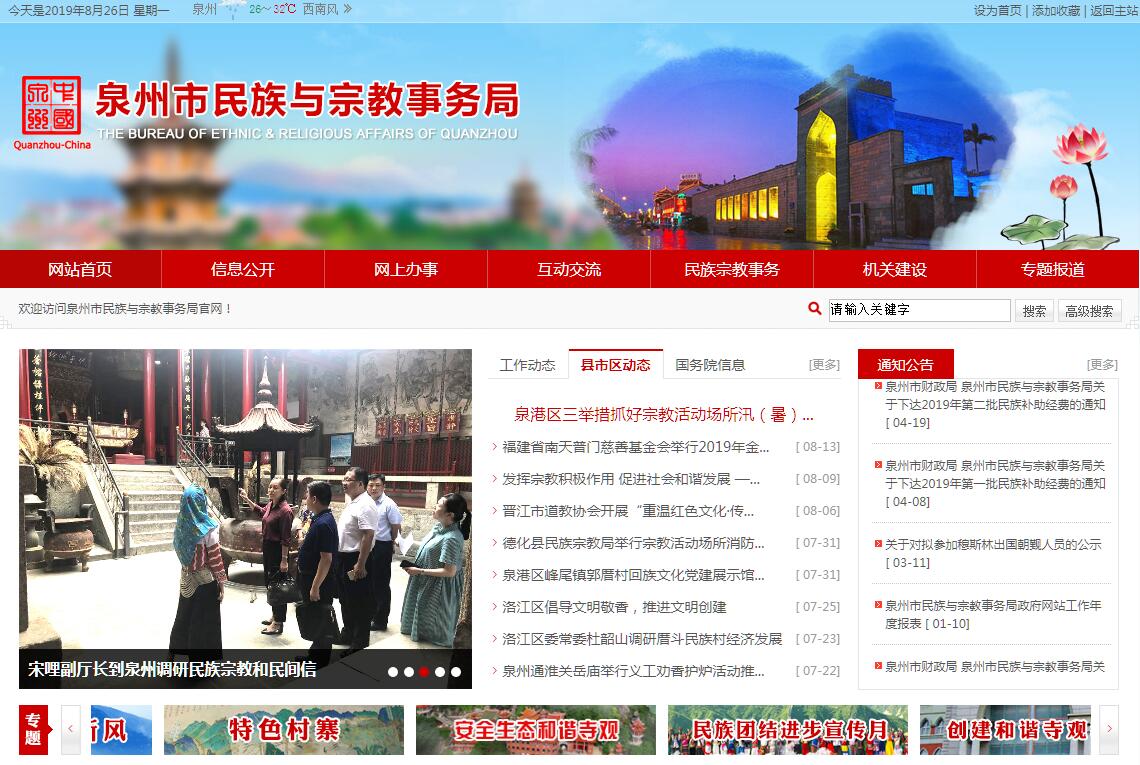 泉州市民族与宗教事务局是市政府主管全市民族和宗教事务工作的职能部门,其主要职责是:(一)贯彻执行党和国家有关民族、宗教工作的法律法规和方针政策,组织民族、宗教政策理论和民族、宗教工作重大问题和难点、热点问题的调查研究,提出有关政策建议。(二)组织、指导民族、宗教政策和法律法规规章的宣传教育工作,负责对县(市、区)政府民族、宗教工作部门的业务指导;组织实施和检查监督民族、宗教法律法规规章和政策的贯彻执行,协调处理民族关系中的重大事项,促进民族和睦、宗教和谐,保障和维护少数民族、宗教界合法权益。(三)负责协调推动有关部门履行民族工作相关职责,协调开展民族团结进步宣传教育活动,协调指导做好城市民族工作,研究提出协调民族关系的工作建议,促进各民族共同团结奋斗、共同繁荣发展。(四)研究分析我市少数民族和民族地区经济社会发展方面的问题并提出政策措施建议,协调、配合有关部门处理的相关事宜,承担市民族工作协调委员会的日常工作。(五)参与起草我市少数民族事业发展专项规划,监督检查实施情况;参与起草少数民族和民族地区经济相关领域的发展规划,建立和完善少数民族事业发展综合评价监测体系,推进民族事务服务体系建设和民族、宗教事务信息化建设。 (六)依法管理宗教事务,依法保护公民宗教信仰自由和正常的宗教活动。指导县(市、区)政府宗教事务部门依法履行职能、处理宗教事务,防范利用宗教进行的非法、违法活动,抵御境外利用宗教进行的渗透活动,指导宗教界开展对外及对港澳台地区的宗教交往活动。(七)指导宗教团体依法依章开展活动,引导宗教界开展与社会主义社会相适应的各项活动,协助宗教团体办理有关事务。(八)贯彻落实民间信仰管理的有关规定,了解掌握民间信仰的动态,对涉及民间信仰的重大问题进行调研并提出建议,协助基层政府及时处理民间信仰方面的重大问题,指导基层民族宗教事务部门做好民间信仰活动及场所的管理工作。(九)负责联系少数民族干部和宗教界代表人士,协助有关部门做好少数民族干部的培养、教育和使用工作。(十)承办市委、市政府交办的其他事项。