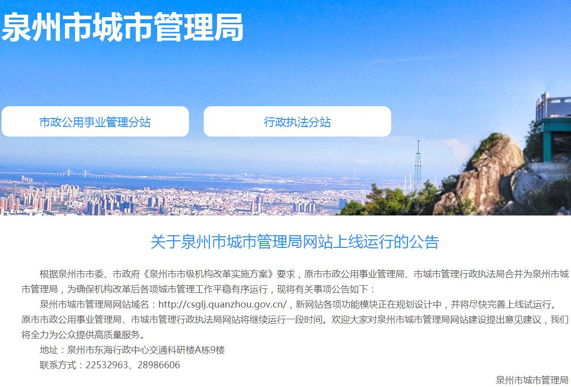 根据《中共福建省委、福建省人民政府关于泉州市人民政府机构改革方案的通知》(闽委[2005]59号) 、《福建省人民政府关于在泉州市开展相对集中行政处罚权工作的批复》(闽政文[2006]507号)、《中共泉州市委、泉州市人民政府关于市政府机构改革的实施意见》(泉委[2005]98号)和《泉州市人民政府印发关于开展城市管理相对集中行政处罚权工作暂行规定的通知》(泉政文〔2007〕59号)精神,在市城市建设监察支队和市城市管理委员会办公室的基础上组建泉州市城市管理行政执法局,加挂泉州市城市管理行政执法支队牌子。泉州市城市管理行政执法局是负责行使城市管理相对集中行政处罚权的市政府工作部门,规格为正处级。按照城市管理重心下移的思路,结合我市实际,市、区城市管理行政执法机构实行“统一领导、分级管理、条块结合、以区为主”的管理体制和“一职多能、综合执法,上下联动、密切配合,堵疏结合、全面覆盖”的工作机制。全市性的执法行动、专项治理以及全局性、突击性的任务由市行政执法局统一组织、统一指挥和统一协调。市城市管理行政执法局主要职责:(一)贯彻执行国家、省和市有关城市管理方面的法律、法规、规章和规定,负责城市管理行政执法政策研究,拟订城市管理行政执法方面的规范性文件;(二)负责指导市区城市管理行政执法工作,制定工作目标和工作规划(计划),对市区城市管理行政执法工作进行监督、检查,组织重大行政执法活动时,统一调配使用市区行政执法人员及执法设备;(三)依法行使城市管理相对集中行政处罚权,负责泉州经济开发区、跨区域性和重大的城市管理行政执法工作;(四)行使综合、指导、监督协调权,对各区行政执法局不依法实施行政行为进行督促纠正;(五)负责组织市区城市管理行政执法法律、法规、规章的宣传教育和业务培训及执法资格的审查工作;协管各区城市管理行政执法局领导干部。(六)负责研究和建立市区统一的城市管理运作与监督机制,建立和完善行政执法责任制、社会服务承诺制、工作考评制、错案追究制,制定《泉州市城市管理行政执法程序规定》、《泉州市城市管理行政执法人员行为规范》等规章制度、行为准则并监督执行;(七)负责制定执法文书,建立执法管理信息系统;(八)负责对市区城市管理行政执法人员的日常监察工作;(九)履行法律、法规、规章和省、市人民政府规定的其他职责;(十)承办市政府交办的其他事项。