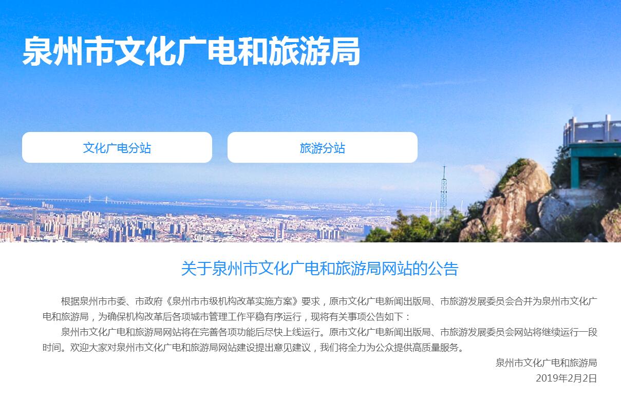 | 网站简介: 根据泉州市市委、市政府《泉州市市级机构改革实施方案》要求,原市文化广电新闻出版局、市旅游发展委员会合并为泉州市文化广电和旅游局,为确保机构改革后各项城市管理工作平稳有序运行,现将有关事项公告如下:泉州市文化广电和旅游局网站将在完善各项功能后尽快上线运行。原市文化广电新闻出版局、市旅游发展委员会网站将继续运行一段时间。欢迎大家对泉州市文化广电和旅游局网站建设提出意见建议,我们将全力为公众提供高质量服务。 |
