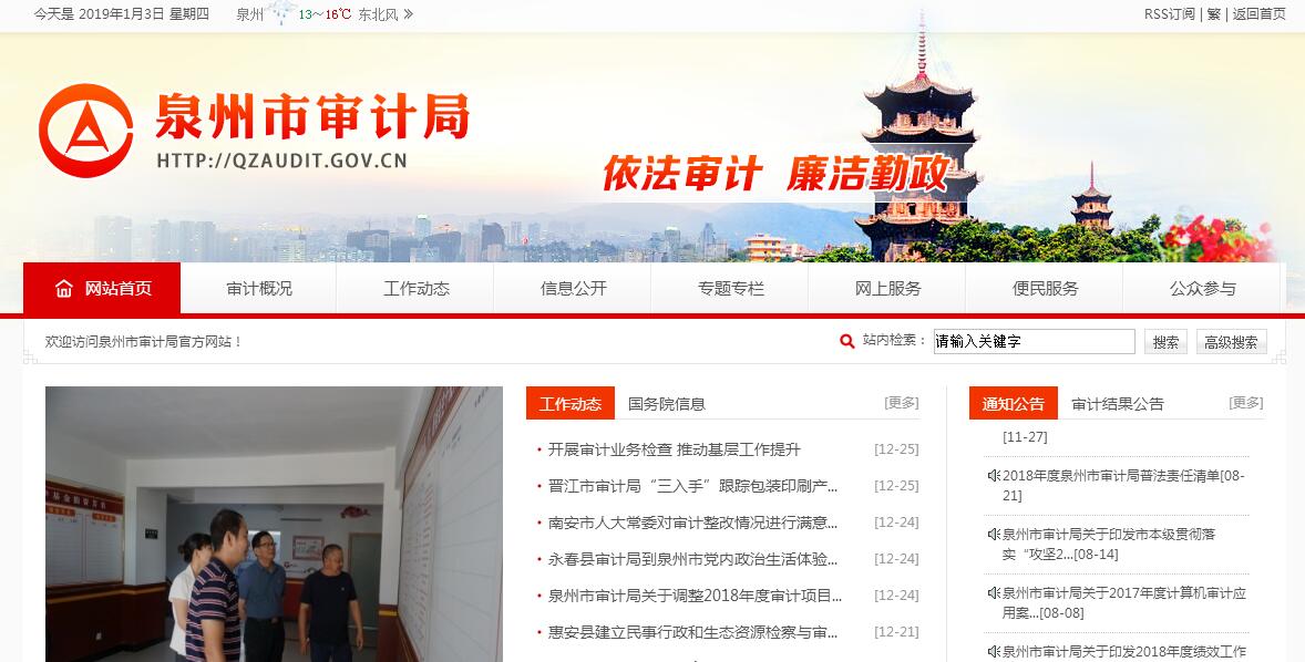 泉州市审计局主要职责:一.对本级各部门(含直属单位)和下级政府预算的执行情况和决算以及其他财政收支情况,进行审计监督。二.在市长和上一级审计机关的领导下,对本级预算执行情况和其他财政收支情况进行审计监督,向本级人民政府和上一级审计机关提出审计结果报告。三、对市属的国家的事业组织和使用财政资金的其他事业组织的财务收支,进行审计监督。四.对市属国有企业的资产、负债、损益,进行审计监督。五.对市级国有资产占控股地位或者主导地位的企业、金融机构的审计监督,按国务院有关规定。六.对市政府投资和以政府投资为主的建设项目的预算执行情况和决算,进行审计监督。七.对市政府部门管理的和其他单位受政府委托管理的社会保障基金、社会捐赠资金以及其他有关基金、资金的财务收支,进行审计监督。八.对国际组织和外国政府援助、贷款项目的财务收支,进行审计监督。九、按照国家有关规定,对国家机关和依法属于审计机关审计监督对象的其他单位的主要负责人,在任职期间对本地区、本部门或者本单位的财政收支、财务收支以及有关经济活动应负经济责任的履行情况,进行审计监督。十.对其他法律、行政法规规定应当由审计机关进行审计的事项,依照本法和有关法律、行政法规有规定进行审计监督。十一.有权对与国家财政收支有关的特定事项,向有关地方部门、单位进行专项审计调查,并向本级人民政府和上一级审计机关报告审计调查结果。十二.根据被审计单位的财政、财务隶属关系或者国有资产监督管理关系,确定审计管辖范围。可以将其审计管辖范围内的审计事项,授权下级审计机关进行审计;对下级审计机关审计管辖范围内的重大审计事项,可以直接进行审计。十三.对依法属于审计机关审计监督对象的单位的内部审计工作的业务进行指导和监督。十四.社会审计机构审计的单位依法属于审计机关审计监督对象的,审计机关按照国务院的规定,有权对该社会审计机构出具的相关审计报告进行核查。十五、承办市政府交办的其他事项。