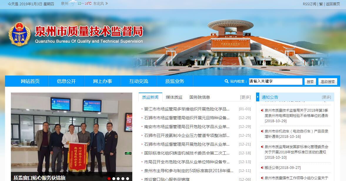 泉州市质量技术监督局主要职责:一、贯彻执行国家质量技术监督法律、法规和方针政策,负责质量技术监督工作相关法律、法规的组织实施和行政执法工作,指导监督所辖县(市、区)质量技术监督综合管理和行政执法工作。二、负责质量宏观管理,组织实施《国家质量发展纲要》;负责落实名牌发展战略,负责管理名牌产品评选工作;负责产品质量诚信体系建设,协助组织重大质量事故调查,协助实施缺陷产品召回制度;会同有关部门实施重大工程设备质量监理制度;承担产品防伪的监督管理工作。三、根据授权管理全市认证认可工作,监督管理全市认证认可活动;根据授权负责全市实验室和检查机构资质认定和监管工作。四、负责产品(除食品、化妆品外,下同)质量监督工作,编制实施产品质量监督抽检计划,组织产品质量监督检验的后处理工作;负责工业产品生产许可证的管理和监督;受理产品质量申诉,组织开展产品质量专项整治工作,依法查处产品质量违法行为。五、负责食品相关产品生产加工环节的质量安全监督管理;按规定权限组织实施食品相关产品生产许可证等市场准入工作;按规定权限组织调查处理相关质量安全事故。六、负责统一管理全市计量工作,推行法定计量单位和国家计量制度,依法管理计量器具及量值传递和比对工作,监督管理计量检定机构、社会公正计量机构及计量检定人员的资质资格,监督管理商品量、市场计量行为和计量仲裁检定;负责机动车安全技术检验机构监督管理。七、负责统一管理全市标准化工作,负责管理采用国际标准产品标志工作;负责企业产品标准备案工作;监督检查标准实施情况;按规定负责组织机构代码和商品条码有关工作。八、负责对全市特种设备安全实施监督管理,负责特种设备应急预警、事故预防和调查处理及分析评估工作;监督检查高耗能特种设备节能标准的执行情况;协助实施缺陷特种设备召回制度。九、负责制定并组织实施质量技术监督的科技发展和技术机构建设规划,负责相应的科研和技术引进工作。十、承办市委、市政府交办的其他事项。