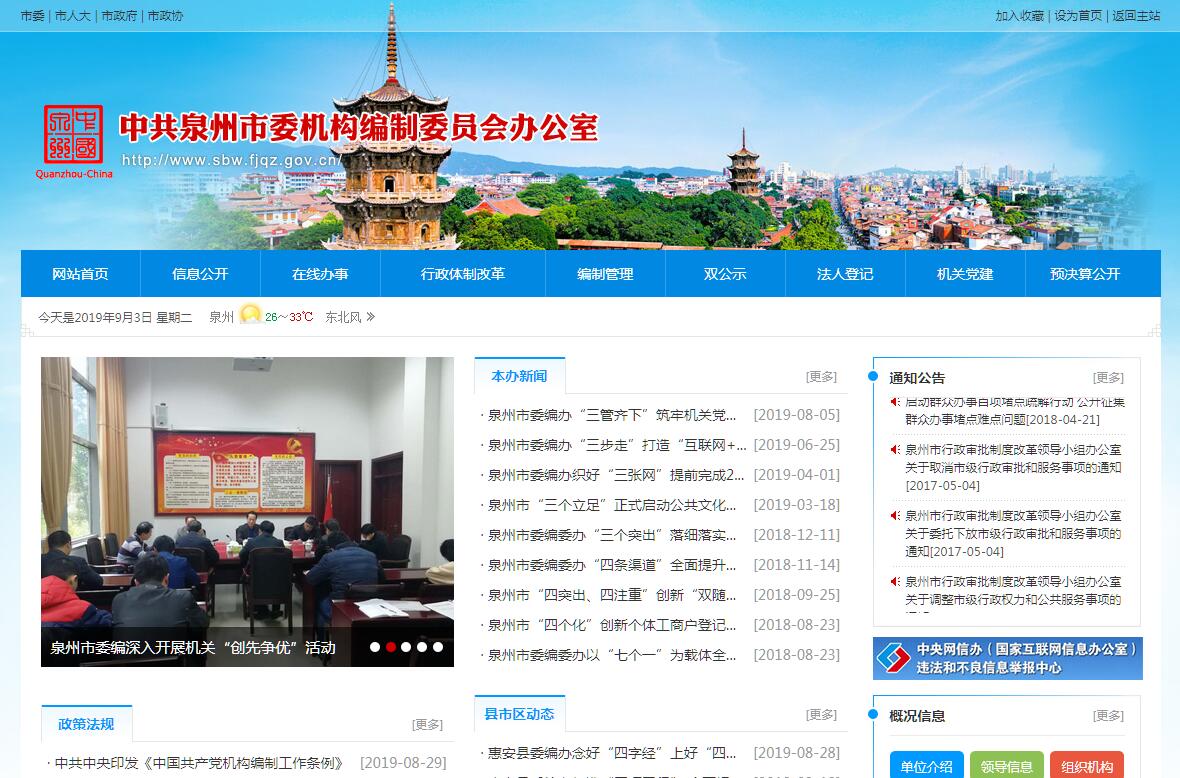 中共泉州市委机构编制委员会办公室,同时挂“泉州市人民政府机构编制办公室”和“泉州市事业单位登记管理局”牌子,列入市委机构序列,为市委机构编制委员会的常设办事机构,既是市委的工作部门,又是市政府的工作部门,机构规格为正处级。其主要职责:(一)贯彻执行党和国家有关行政管理体制、机构改革以及机构编制管理的方针、政策、法规,研究拟定本市行政管理体制、机构改革、机构编制管理的政策规定和实施细则,统一管理全市各级党政机关,人大、政协、检察院、法院机关,各民主党派、人民团体机关及事业单位的机构编制工作。(二)研究制订全市各级行政管理体制与机构改革的总体方案及实施办法。审核市级党政群机关各部门以及县(市、区)、乡镇机构改革方案,指导、协调全市各级行政管理体制、机构改革和机构编制管理工作。(三)协调市级党政群机关各部门的职能配置与调整,协调各部门之间以及各部门与县(市、区)之间的职责分工;负责市级党政群机关、驻外机构和具有行业管理职能的单位职能配置、内设机构、人员编制、领导职数以及人员编制结构、人员变动使用编制审核、审批工作;负责县(市、区)党政群工作机构的设置与调整,县(市、区)、乡镇机关人员编制总额的审核,各类经济技术开发区、投资区行政管理机构设置和人员编制的审核;负责审核、审批市、县(市、区)各级党政群机关副科级以上(含副科级)机构的设置与调整。审核市级议事协调机构和临时机构。(四)研究制订全市事业单位管理体制和机构改革的总体方案及其配套的有关政策措施;负责市属副处级以上事业单位机构设置、主要职责、人员编制、领导职数、人员编制结构及县(市、区)属相当于副处级以上事业单位设置的审核;负责市直事业单位机构设置、主要职责、规格、人员编制、领导职数、人员编制结构、人员变动使用编制及县(市、区)所属事业单位确定正、副科级规格的审批;负责办理事业单位机构编制管理方面的其它事项;指导、协调各级事业单位机构改革和机构编制管理工作。(五)监督检查机构编制政策法规、各级机构改革方案执行情况和机构编制管理工作情况,对随意增设机构、机构升格、增加人员编制和领导职数,以及不遵守有关管理权限和审批程序,擅自审批机构编制等违反机构编制法规的行为,予以纠正或提出意见报告市委、市政府和市委机构编制委员会。(六)负责行政管理体制、机构改革及机构编制管理的宣传、理论研究和信息传递、交流工作,负责机构编制工作的情况综合、干部培训以及统计业务工作等。(七)负责联系中央、省在泉机构的有关机构编制工作,负责省委编委下达有关部门专项编制的分配和管理工作。(八)负责机关事业单位登记管理的各项工作,参与管理机关事业单位统一代码标识工作。(九)完成市委、市政府和市委机构编制委员会交办的其它事项。