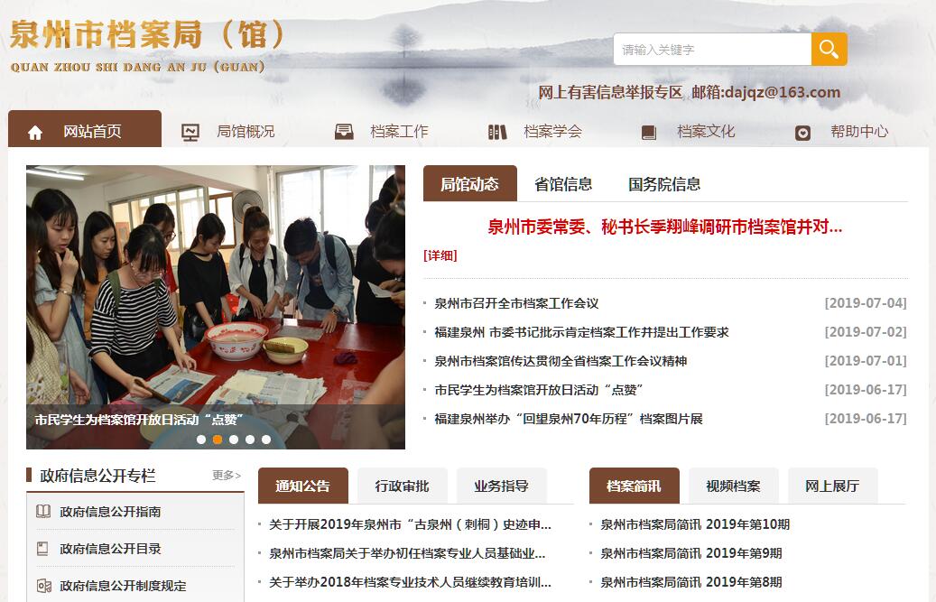 泉州市档案局(馆)领导班子大力弘扬爱拼敢赢的泉州精神,着力构建充满生机和活力的“学习型、服务型、创新型”档案局馆,全面提升档案法制化、信息化、现代化、社会化水平,有力地促进了我市档案事业的全面科学发展,营造了和谐共赢的良好局面。 近年来,泉州市档案局(馆)不断提高管理水平和服务能力,各项工作全面发展,取得了显著成效。在精神文明建设方面:2000年、2003年、2006年、2009年、2012、2015年连续六次被省委、省政府授予第七、八、九、十、十一、十二届“省级文明单位”。在党建方面:2000年-2017年连续十一次被泉州市市直党工委授予“先进五好党支部”,2017年被泉州市市直党工委授予“先进五好党支部”标兵,2002年、2004年、2007年、2010年、2013、2015年连续六轮被泉州市委授予“机关党建工作先进单位”称号,2003年、2008年被市委授予“先进基层党组织”,2008年被省委授予“全省先进基层党组织”。在档案业务建设方面:1999年、2003年、2007、2015年四次被国家人社部、国家档案局授予“全国档案系统先进集体”;2003年、2006年被省人事厅、省档案局授予“档案工作先进单位”;2003年被认定为福建省首家“特级档案馆”;2007年被认定为福建省首家“aaa级档案馆”;2009年1月被认定为“国家一级档案馆”。2010年3月,泉州市档案局“侨批档案”入选《中国档案文献遗产名录》;2012年5月,“侨批档案”入选世界记忆亚太地区名录;2013年6月19日,“侨批档案”成功入选“世界记忆遗产名录”。泉州市档案局(馆)的主要职责是:贯彻执行《档案法》及档案工作的法律、法规和方针政策,进行行政执法监督;制定、实施全市档案事业发展规划和档案工作规章制度;对全市各县(区、市)档案局(馆)、各类专业档案馆、市直机关、团体、企事业单位和其他组织、重点项目的档案工作进行监督指导;组织并指导全市档案理论研究、档案教育、职称评聘工作;负责接收市直各机关、团体及其所属单位移交的档案资料,组织实施馆藏档案的保管、整理、编目、统计、鉴定、解密、开放、利用、编研等工作,为社会各界提供服务。