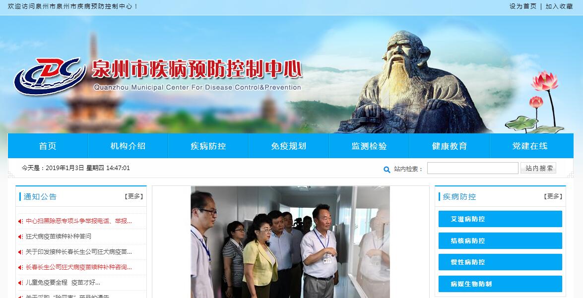 泉州市疾病预防控制中心是全市疾病预防控制业务工作的技术指导中心,承担传染病、职业病、地慢病和寄生虫病预防控制,食品卫生、环境卫生、劳动卫生、放射卫生、学校卫生的监测,健康教育,消毒、杀虫、灭鼠和预防医学科研培训等任务。目前,中心在编人员有114人,具备高级职称任职资格者占33%,本科以上学历占83%。拥有生活饮用水中有机污染物检测系统、脉冲场电泳系统及凝胶成像系统、三重串联四极杆液质联用仪、气质联用分析仪、超高效液相色谱仪、原子荧光仪、离子色谱仪、原子吸收分光光度计、实时荧光定量PCR仪、荧光显微镜等重要仪器设备。中心建筑面积1.4万m2,其中实验室面积达5000 m2,是我省规模较大、配套较完整、环境较优美的地市级疾病预防控制机构。市疾控中心是四川大学华西公卫学院和福建医科大学公卫学院教学科研基地、泉州医高专实训基地,是福建省卫生计生系统首家通过实验室国家认可的单位,是全省九地市首家通过计量认证/认可的疾控机构实验室,是我市首家同时通过“建设项目职业病危害评价”、“职业健康检查”、“职业病诊断”、“放射卫生防护检测与评价”等四项职业卫生技术服务机构资质认证的单位,并通过了食品检验机构资质认定。中心是我市惟一的国家级流感监测网络实验室、艾滋病病毒确认实验室,能开展病毒核酸检测、病毒细胞培养等检测工作,毒物和病毒检测水平在省内处于领先位置。最近几年来,市疾控中心围绕“泉州疾控事业走在全省发展前列”的奋斗目标,推动管理和运行机制创新,带动我市疾控体系步入良性运行轨道。出色地完成了人感染高致病性禽流感、人感染H7N9、诺如病毒感染性腹泻、肠道病毒埃可 30型病毒性脑炎、全省首例输入性基孔肯雅热、霍乱、手足口病、革登热等重大传染病防控,以及巩固提升创建国家卫生城市成果等工作任务。积极扩大儿童免疫规划覆盖面,各种计划内疫苗报告接种率均达95%以上。多措并举提高各种人群的健康素养,并具体承担卫计系统与泉州晚报、泉州电视台联办的健康栏目采编工作,有力保障了全市人民身体健康,维护了社会安定稳定。中心积极组织应用性科研课题研究,近几年有多个课题获泉州市科技进步奖。组队参加全省疾控业务技能竞赛,获突发急性传染病防控和突发中毒事件应急处置综合成绩第一名、结核病防治团体第二名。通过提供订单式培训、上门培训、专项培训、生产带教等方式方法,指导、带动基层单位提高业务水平。市疾控中心以增进人民健康福祉为己任,在履行公共服务职能的实践中贯彻科学发展观,被省委、省政府授予“创建文明行业工作先进单位”,被省公务员局等多部门联合授予“全省医药卫生系统先进集体”称号,连续八届被市委、市政府授予“文明单位”荣誉。中心党总支被市直党工委评为“先进基层党组织”,行政、卫生两个党支部连续两届被评为“先进‘五好’党支部”,离退休支部为“‘五好’党支部”。近几年涌现出泉州市“工人先锋号”集体和福建省五一劳动奖章获得者、“泉州市优秀健康卫士”等一批先进个人。